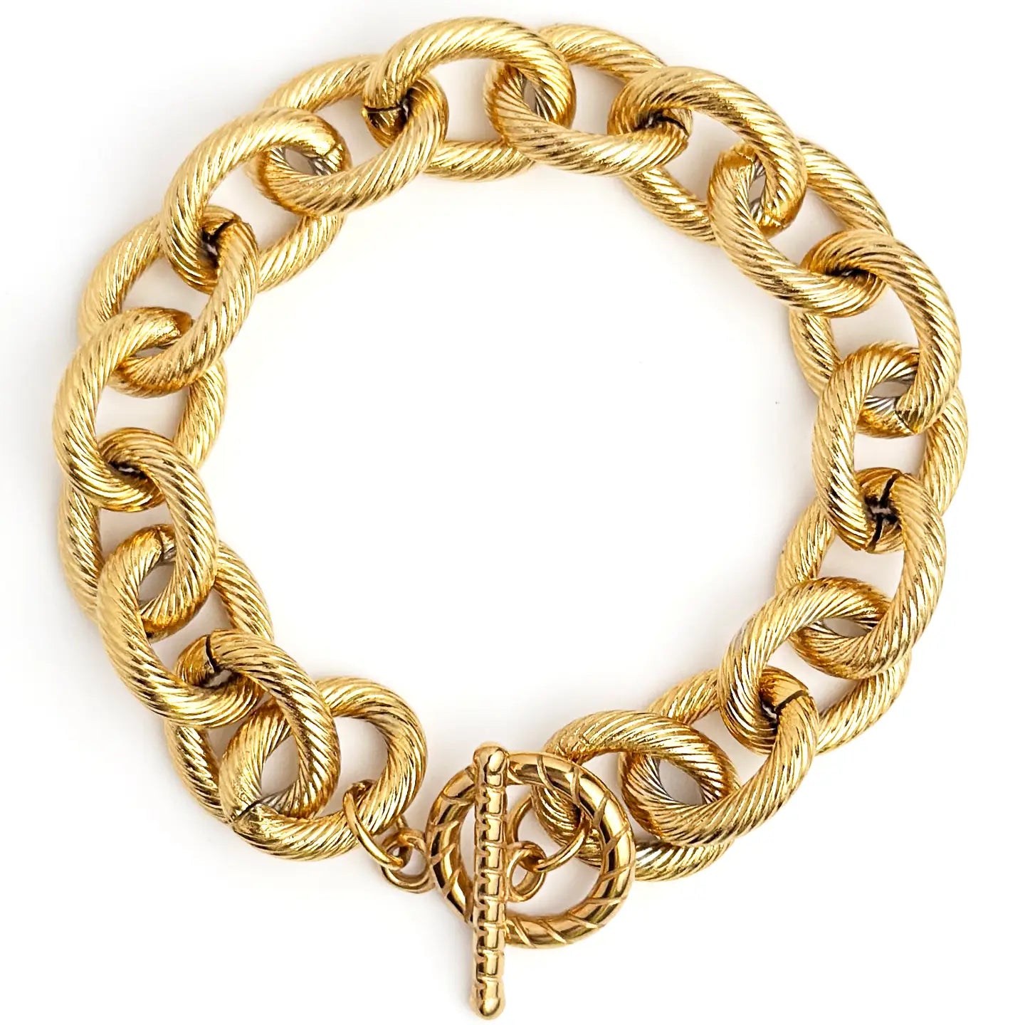 Elevate your everyday style with this bold rope link bracelet, crafted from stainless steel with a luxurious gold finish. Waterproof and tarnish-proof, this durable piece withstands daily wear without compromise. Wear it solo for a statement moment, layer it with other pieces, or pair it with the matching necklace to complete a coordinated look. Versatile enough for any occasion, this bracelet is the investment piece your collection deserves.