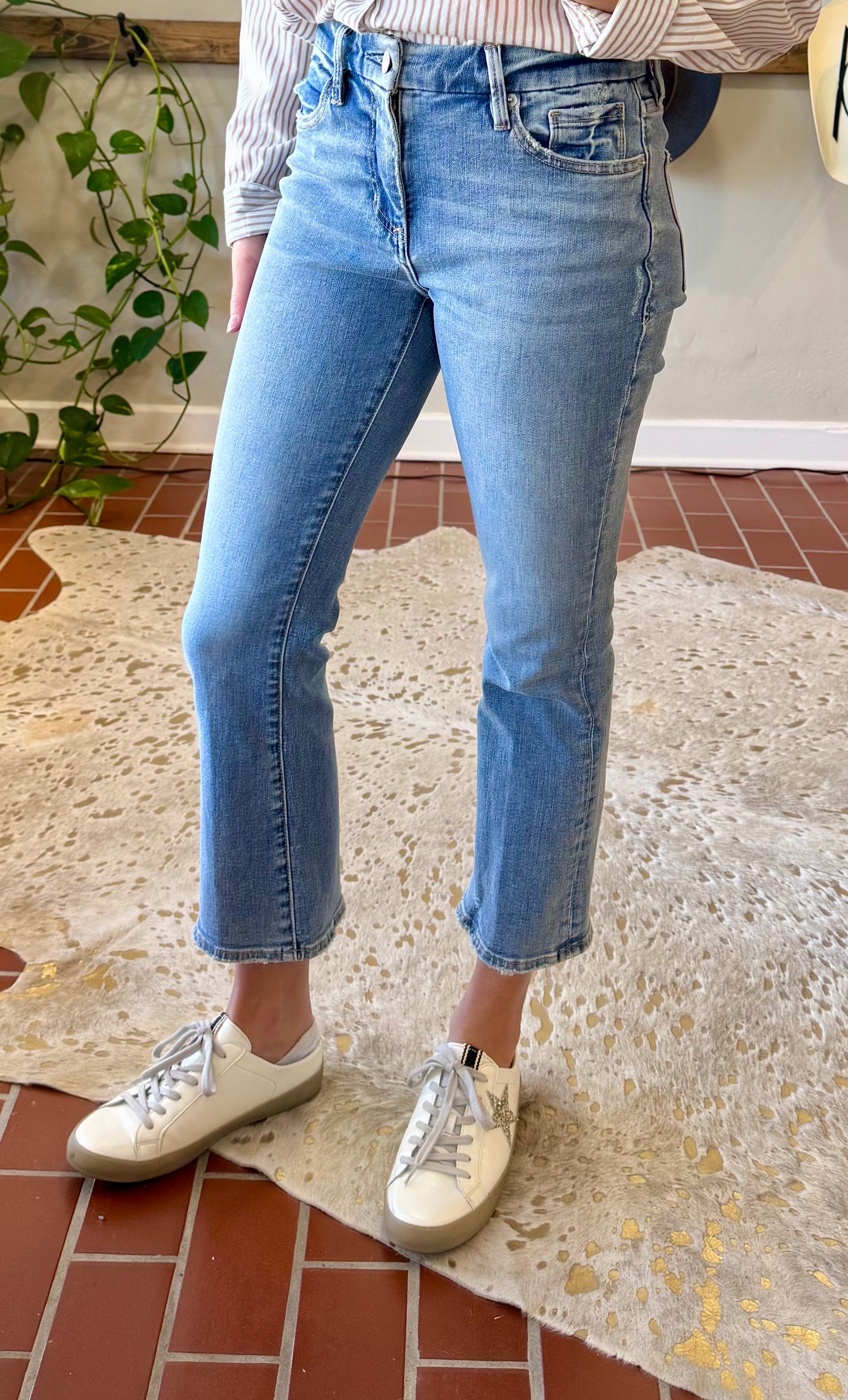 These mid rise jeans feature a flattering flare leg and a clean hem, offering a fashionable denim fit in a modern cropped silhouette.