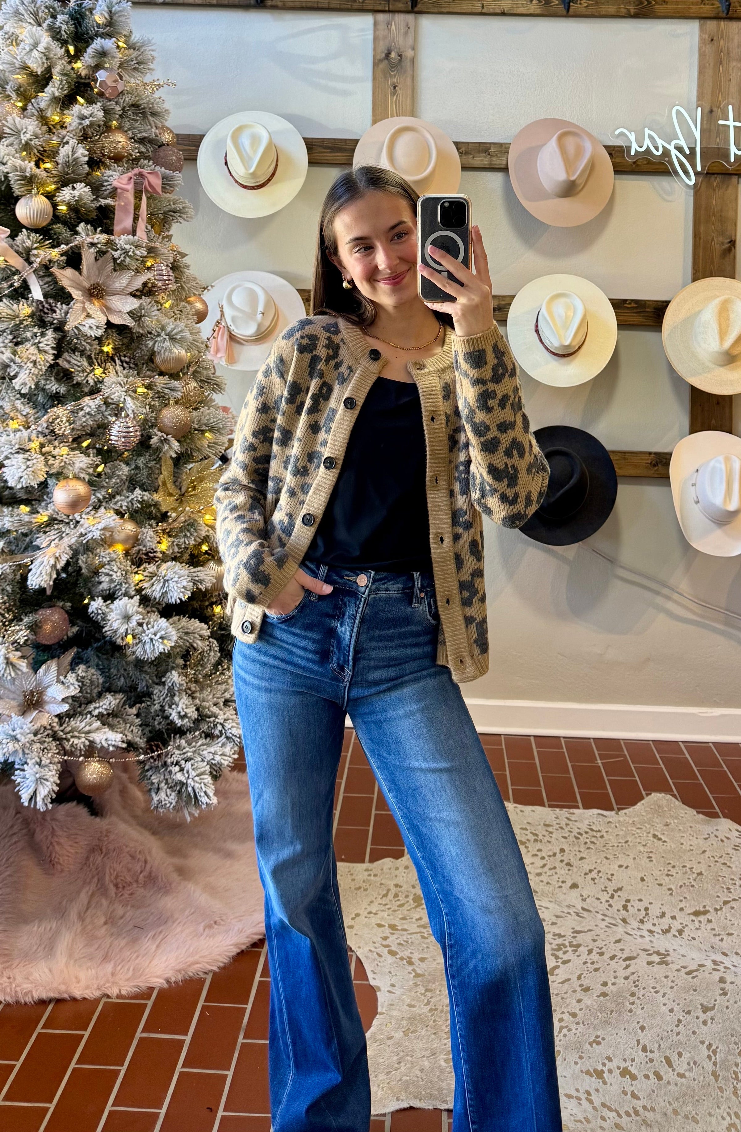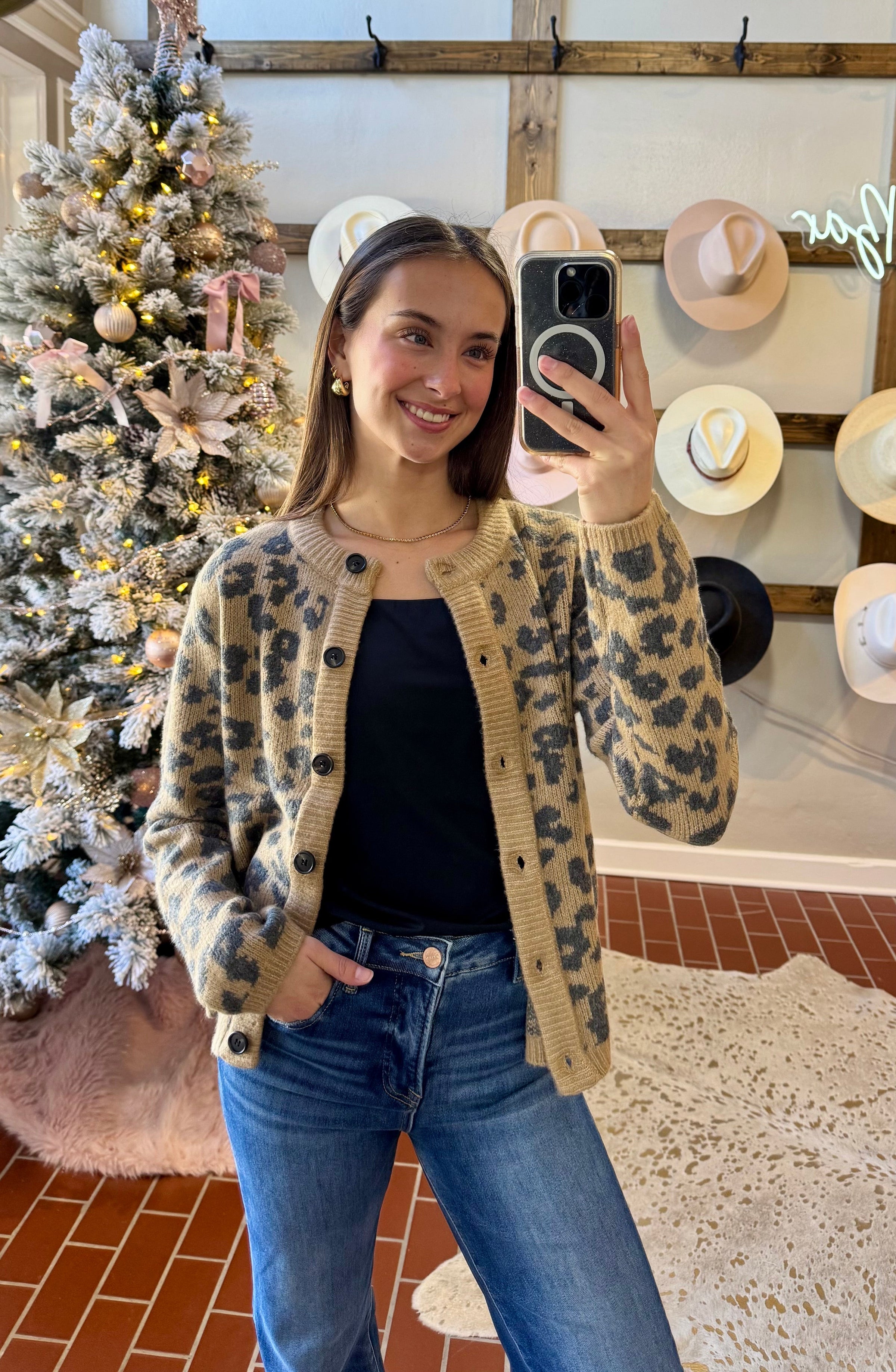 Amina cardigan sweater in long sleeve jacquard featuring a striking leopard print, offers a classic fit that is perfect for layering or wearing on its own.