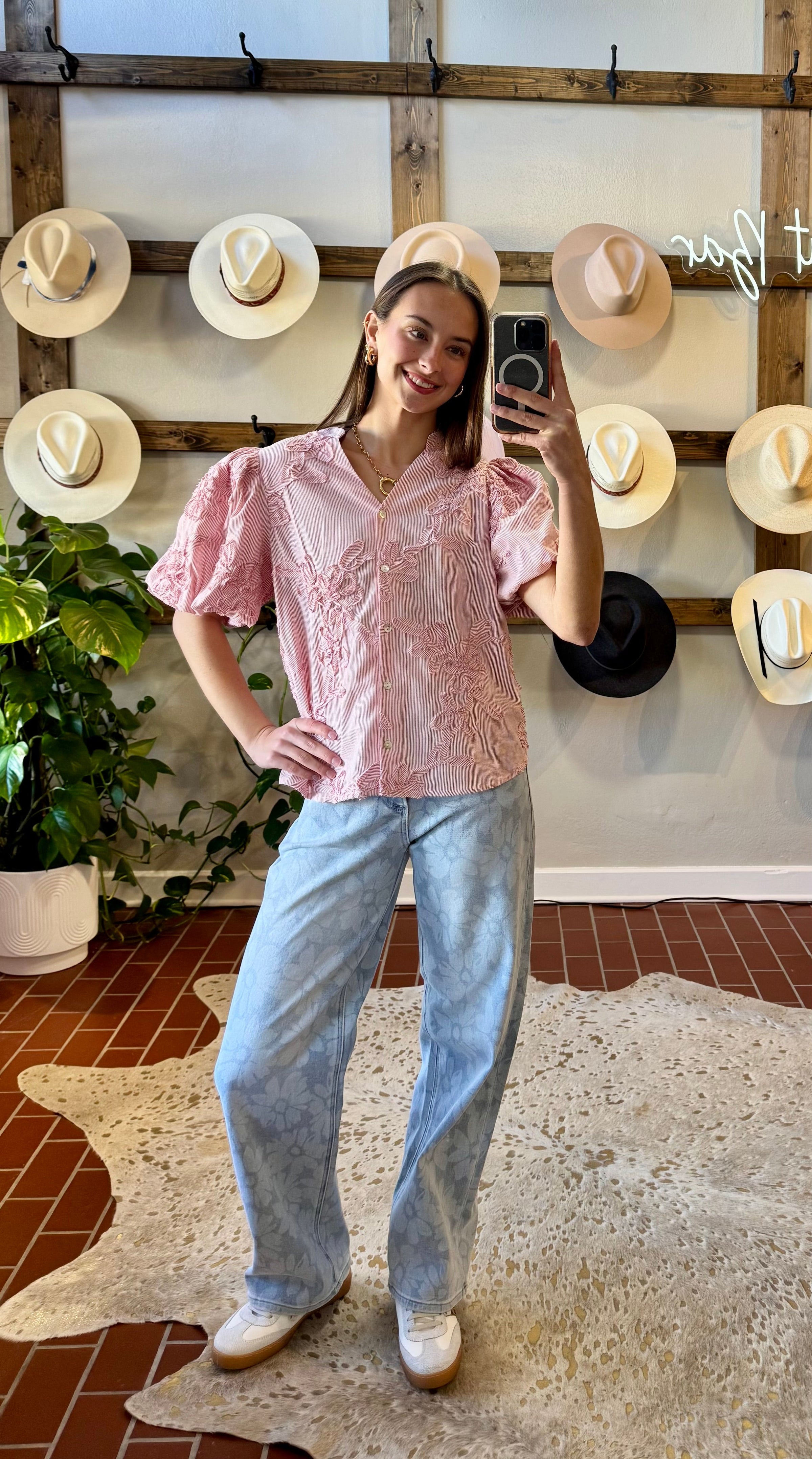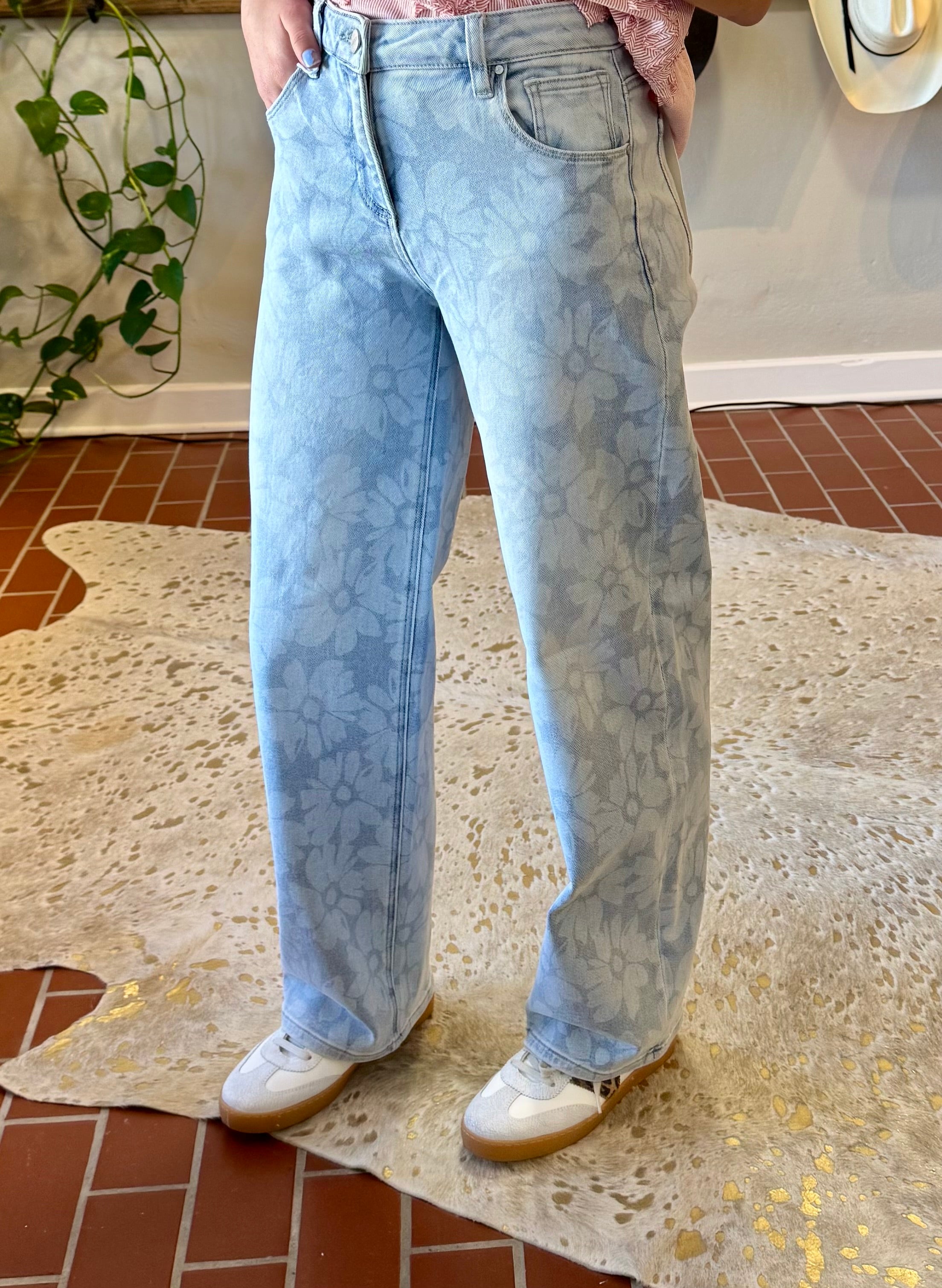Make these Risen Daisy Baggy Jeans your go-to for warm-weather dressing. The light-wash denim showcases a charming floral pattern, while the high-rise silhouette and relaxed baggy cut deliver comfort without compromise. Generous stretch fabric moves with you, and sizing down ensures a tailored fit that flatters.
