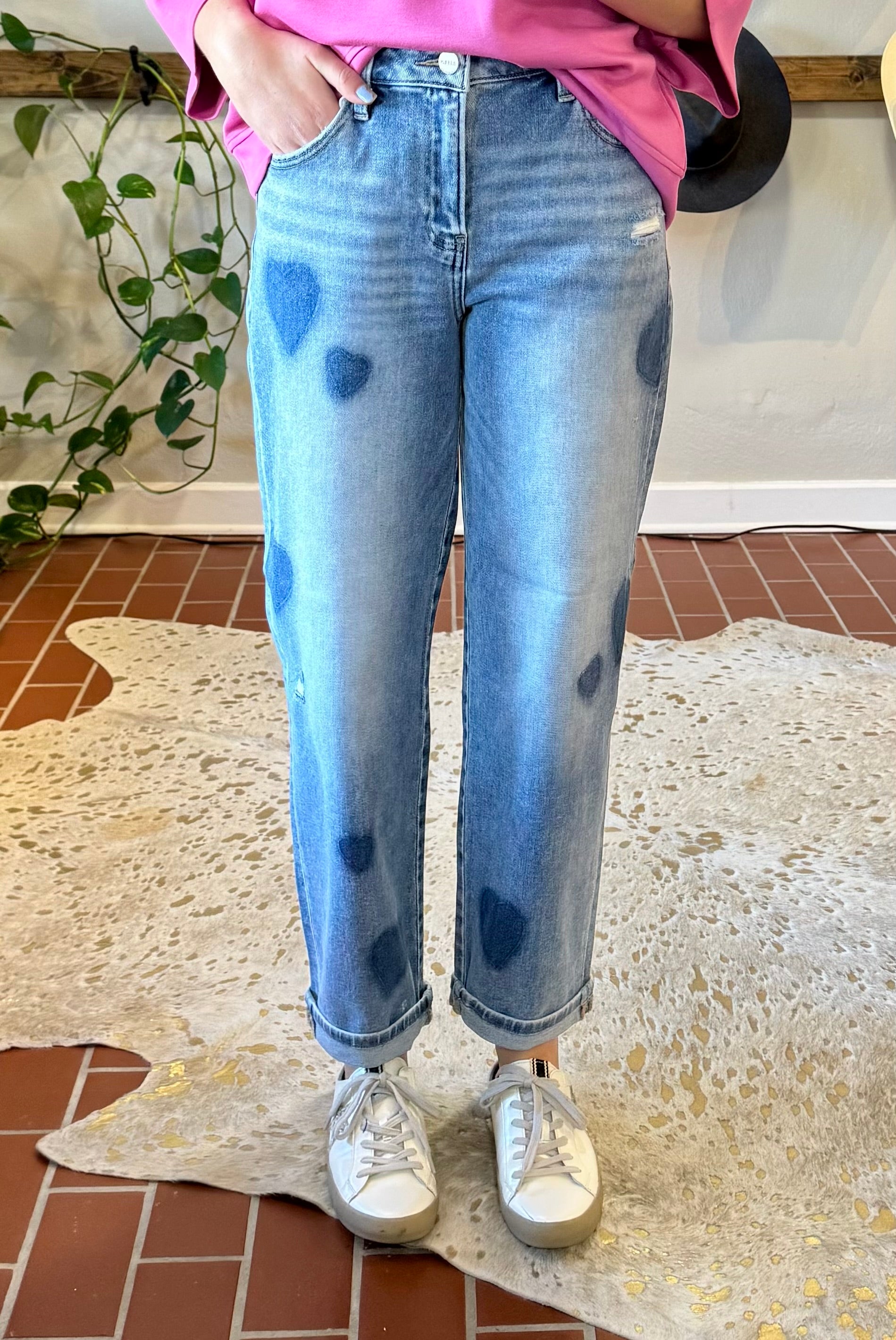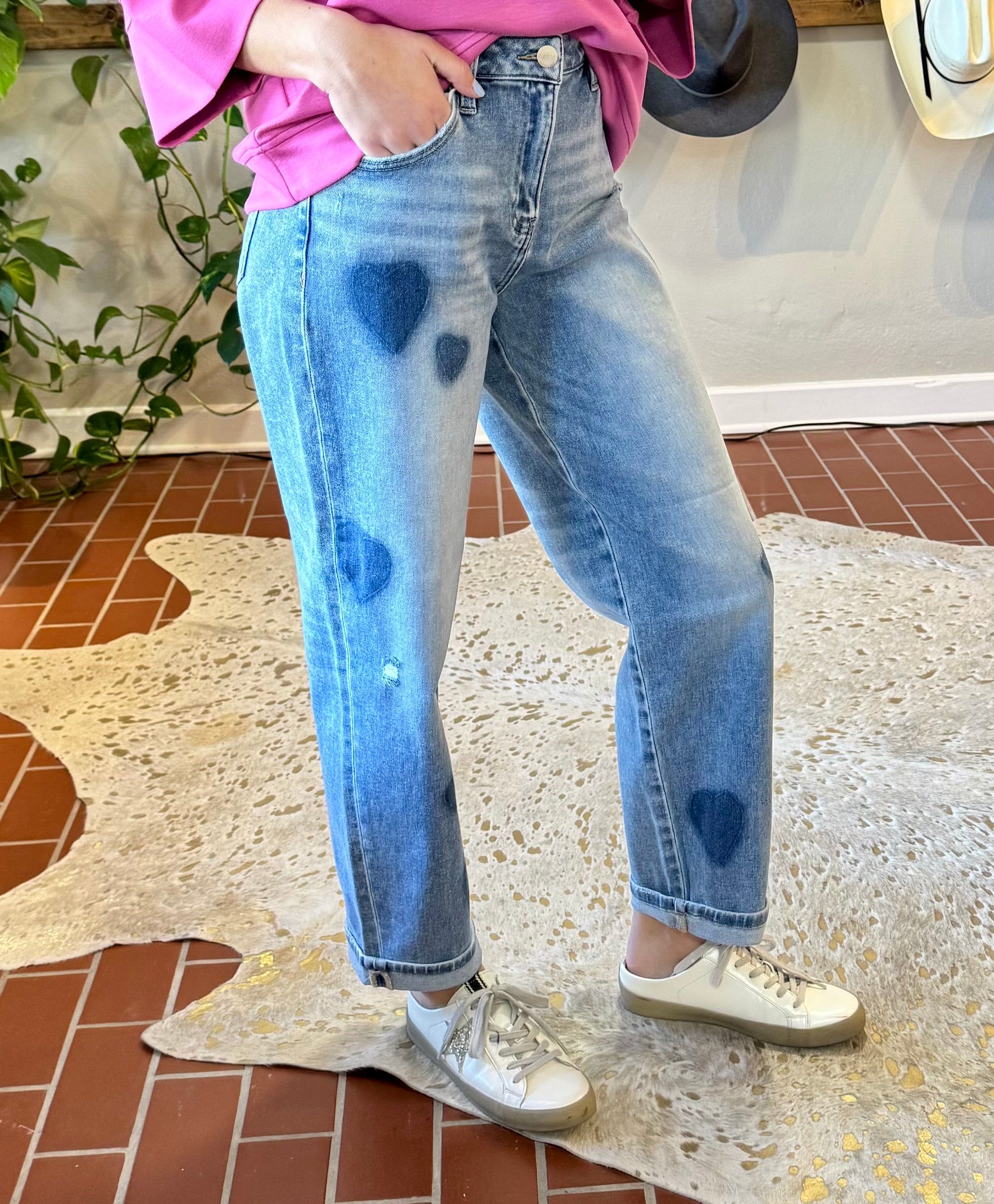 Risen Heartbreaker Boyfriend Jeans bring playful charm to your warm-weather wardrobe. Adorned with heart-shaped patches throughout, these denim staples deliver the perfect blend of comfort and style. The generous stretch fabric moves with you, while the slouchy silhouette flatters every frame. Wear them true to size for a relaxed fit or size down for an extra-baggy vibe—either way, you'll love how effortlessly cool they feel. Perfect for spring and summer adventures.