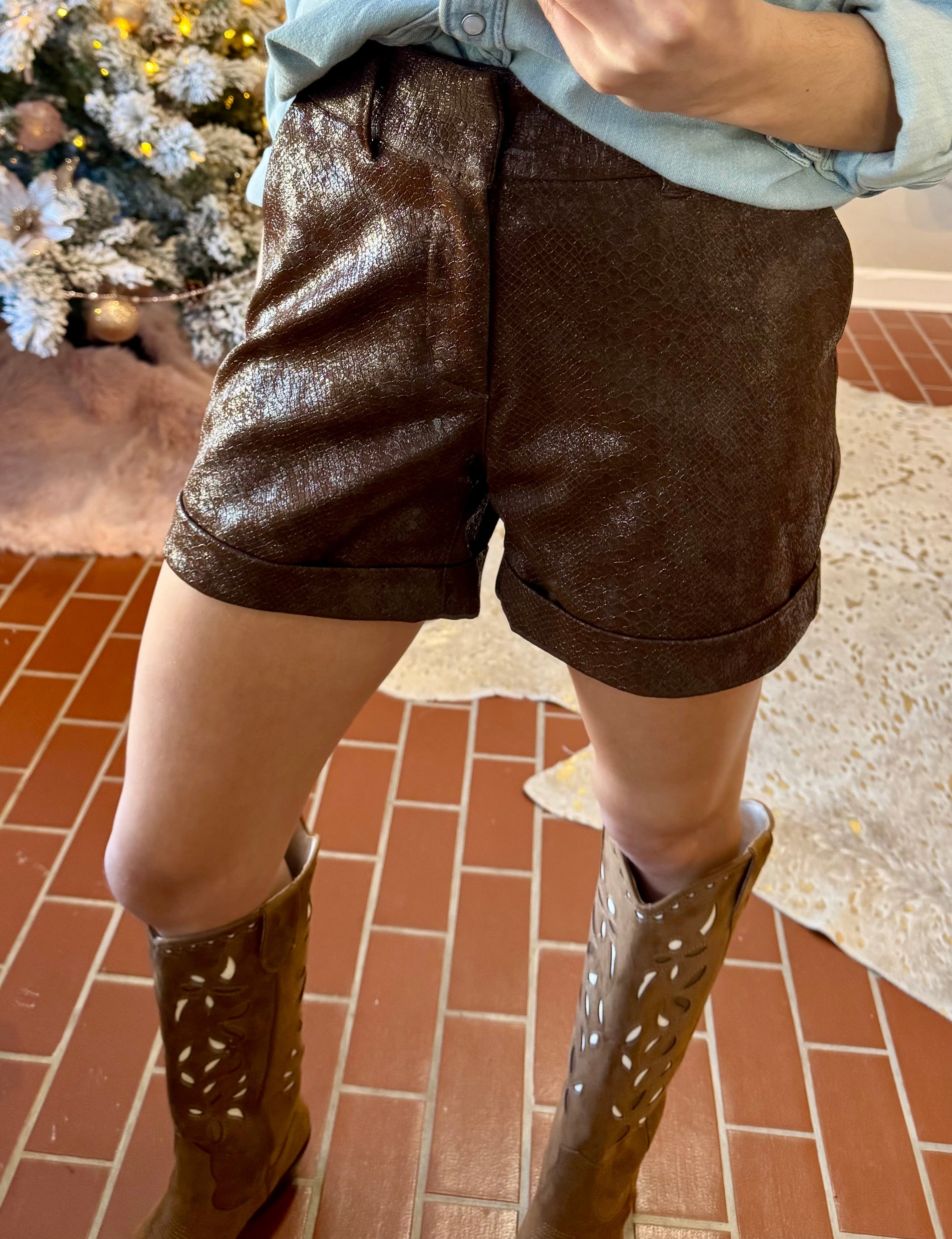 High rise shorts trouser leg finish. The exclusive sophisticated fit that impeccably sits slightly lower on the waist, providing a unparellel tailored and relaxed feel in the hip and thigh. Shorts inseam on exquisite snake print and cuffed hem.