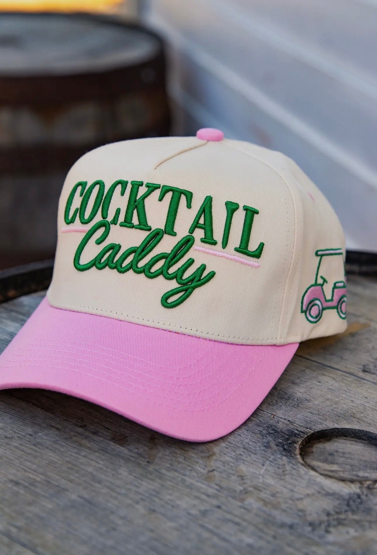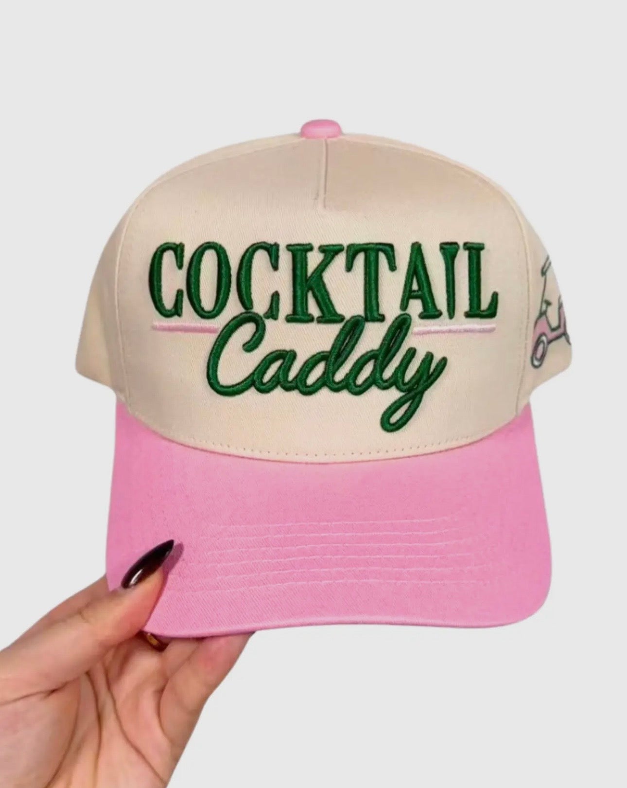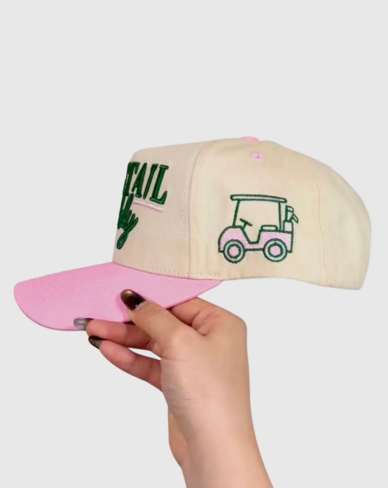 Hit the course in style with the Cocktail Caddy Hat—the perfect accessory for golf enthusiasts and cart riders alike. This classic white and cream canvas snapback features charming green embroidery that celebrates the golfing lifestyle with a playful twist. Comfortable, adjustable, and designed for those who appreciate both fashion and function on the fairway. Whether you're swinging clubs or enjoying the ride, this hat keeps you looking sharp while shielding you from the sun.