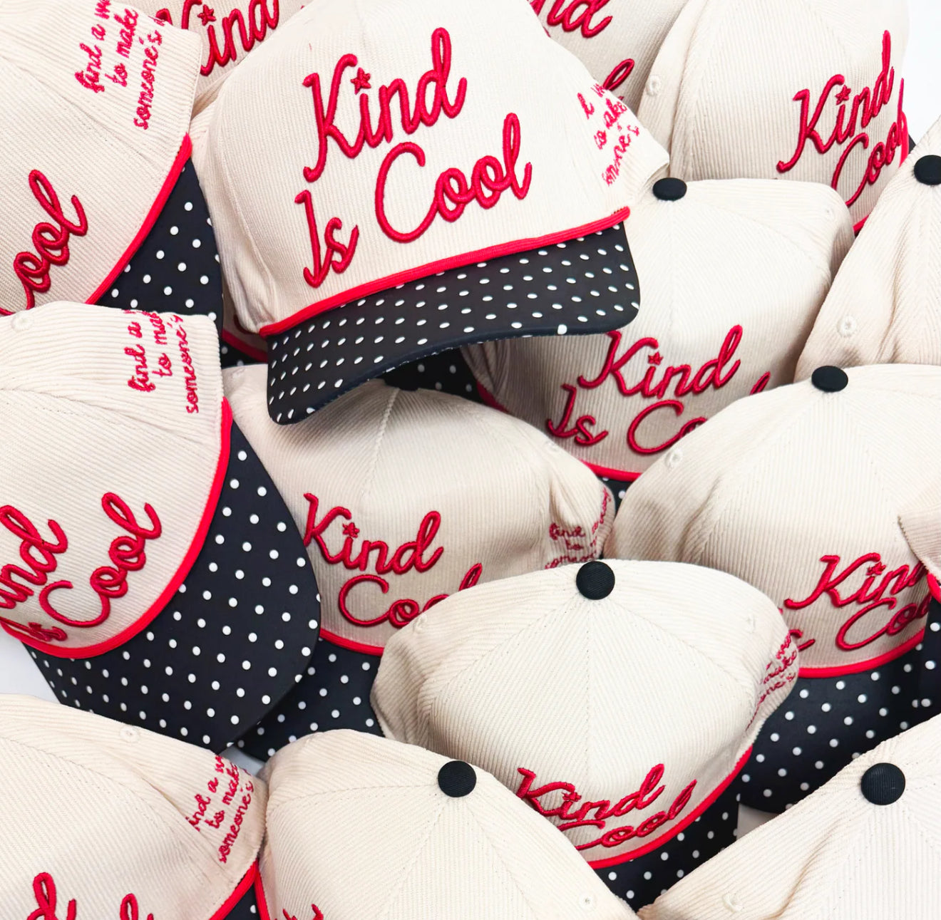 Corduroy and Canvas hat embroidered with adjustable snap back. Side panel "Find a way to make someone's day"