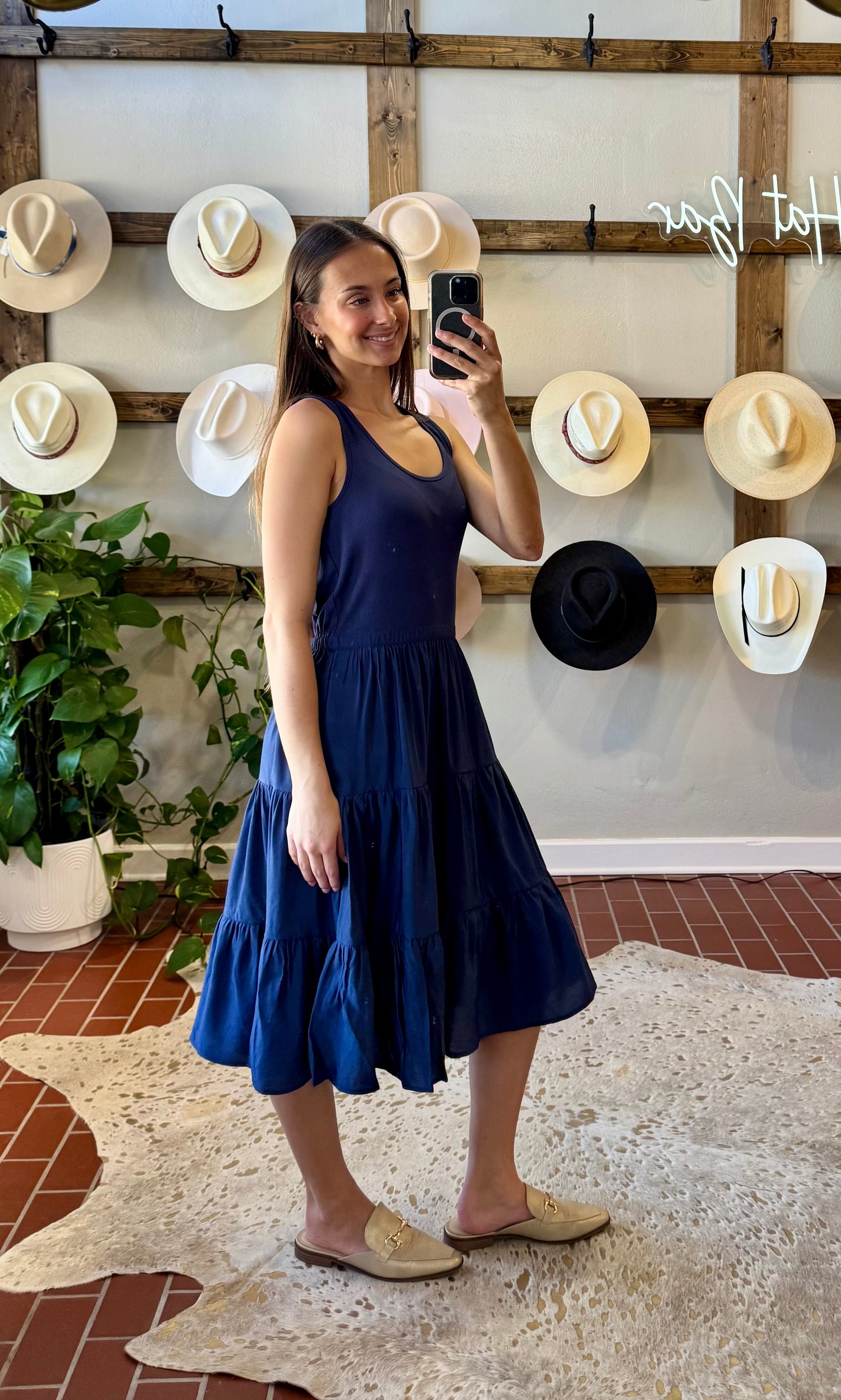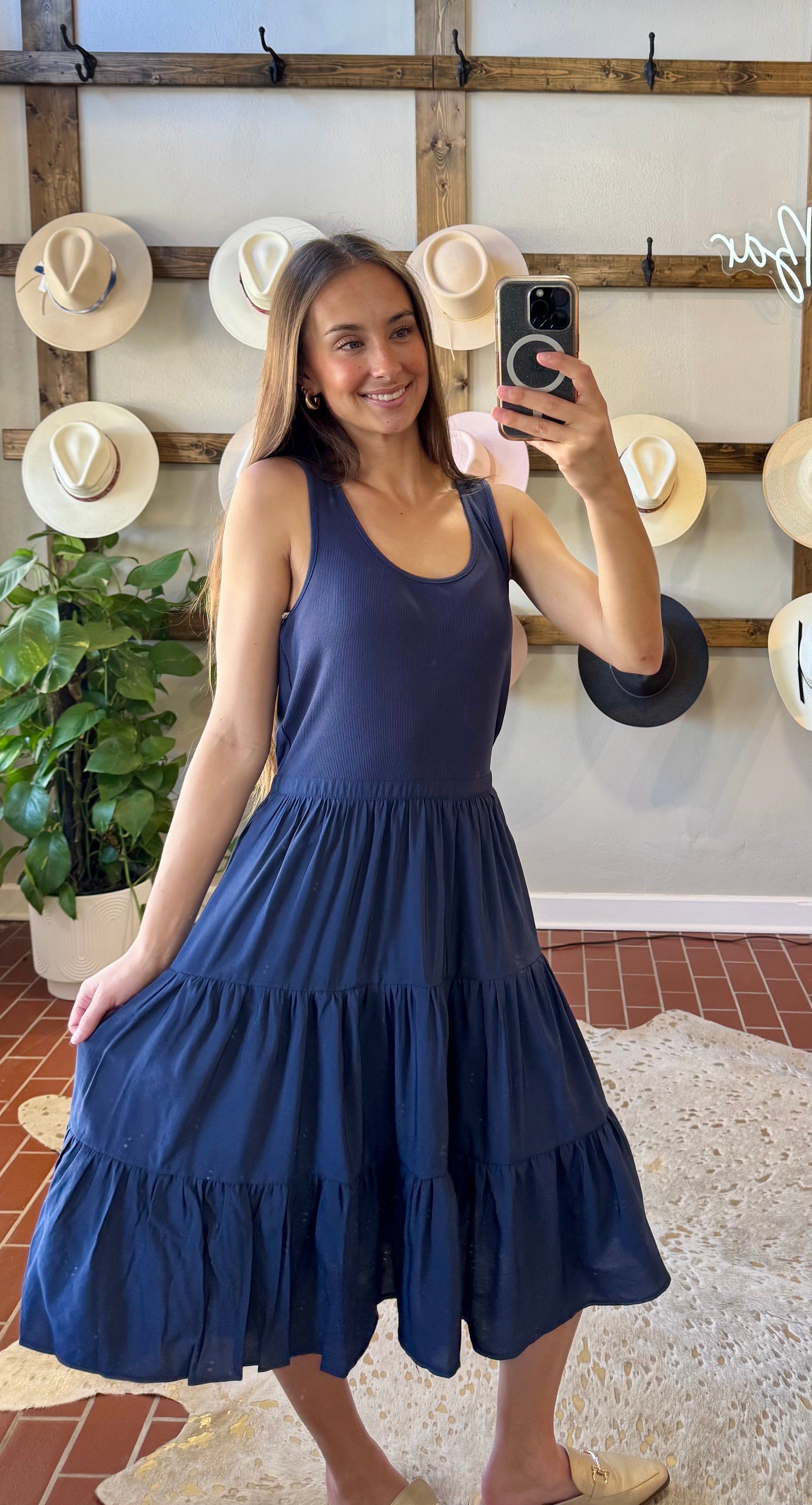 Portia rib tank midi dress with multi-tiered skirt contrast finished sleeveless with neck and armhole bias. Solid color knit on standard fit. Ever the delight, perfect aesthetic to life's leisurely pursuits! BODY: 93% RAYON, 7% SPAN, SKIRT: 85% COTTON, 15% POLY Machine wash cold, Tumble dry low Imported The ribbed bodice hugs your curves while providing all-day comfort in detailed measurements: Body length from HPS: 43", Sleeve length: N/A, Bust: 30" (Size Small) A unique design that effortlessly transitions from casual outings to chic evenings, making this the ultimate piece in comfortable clothing for women.