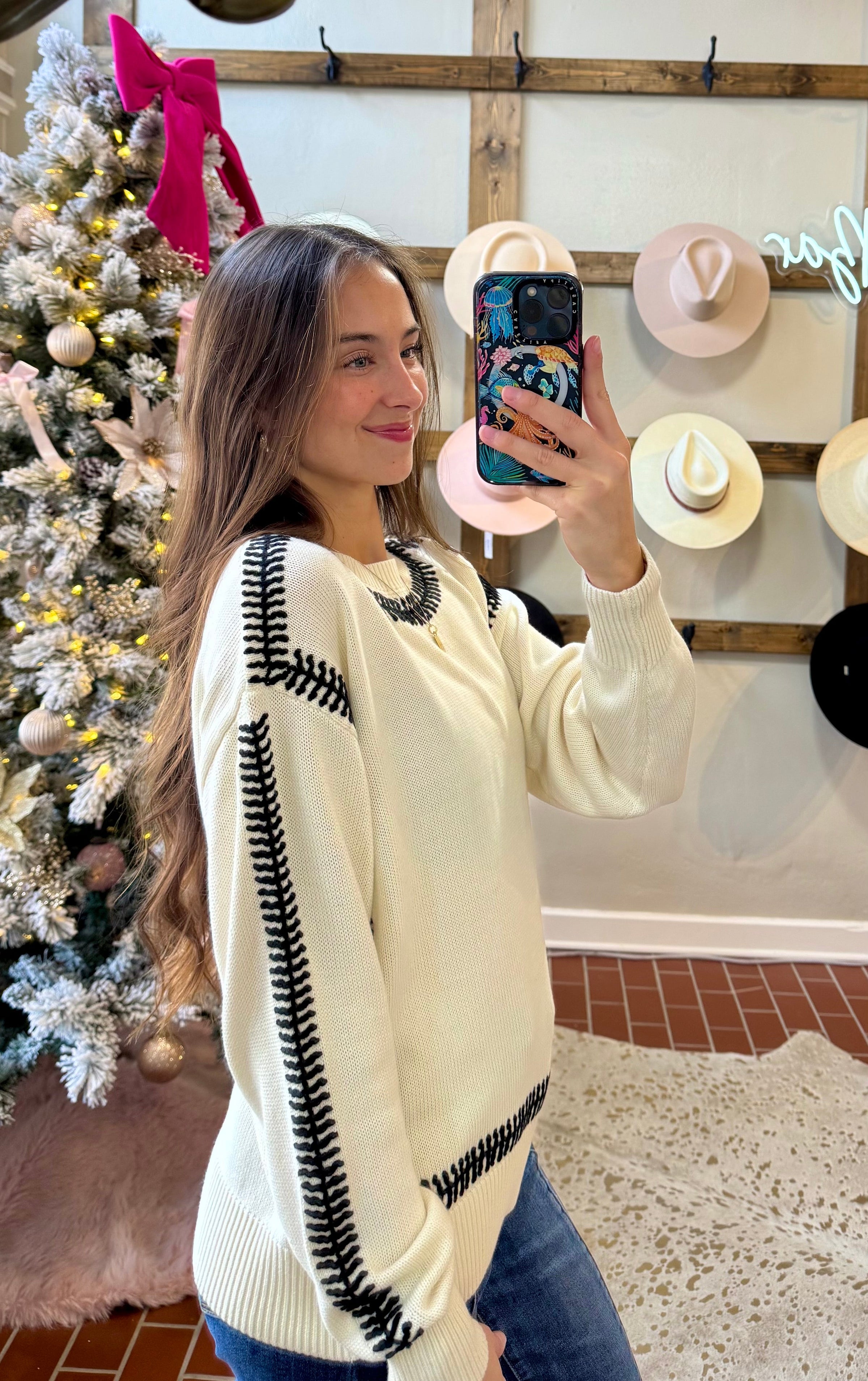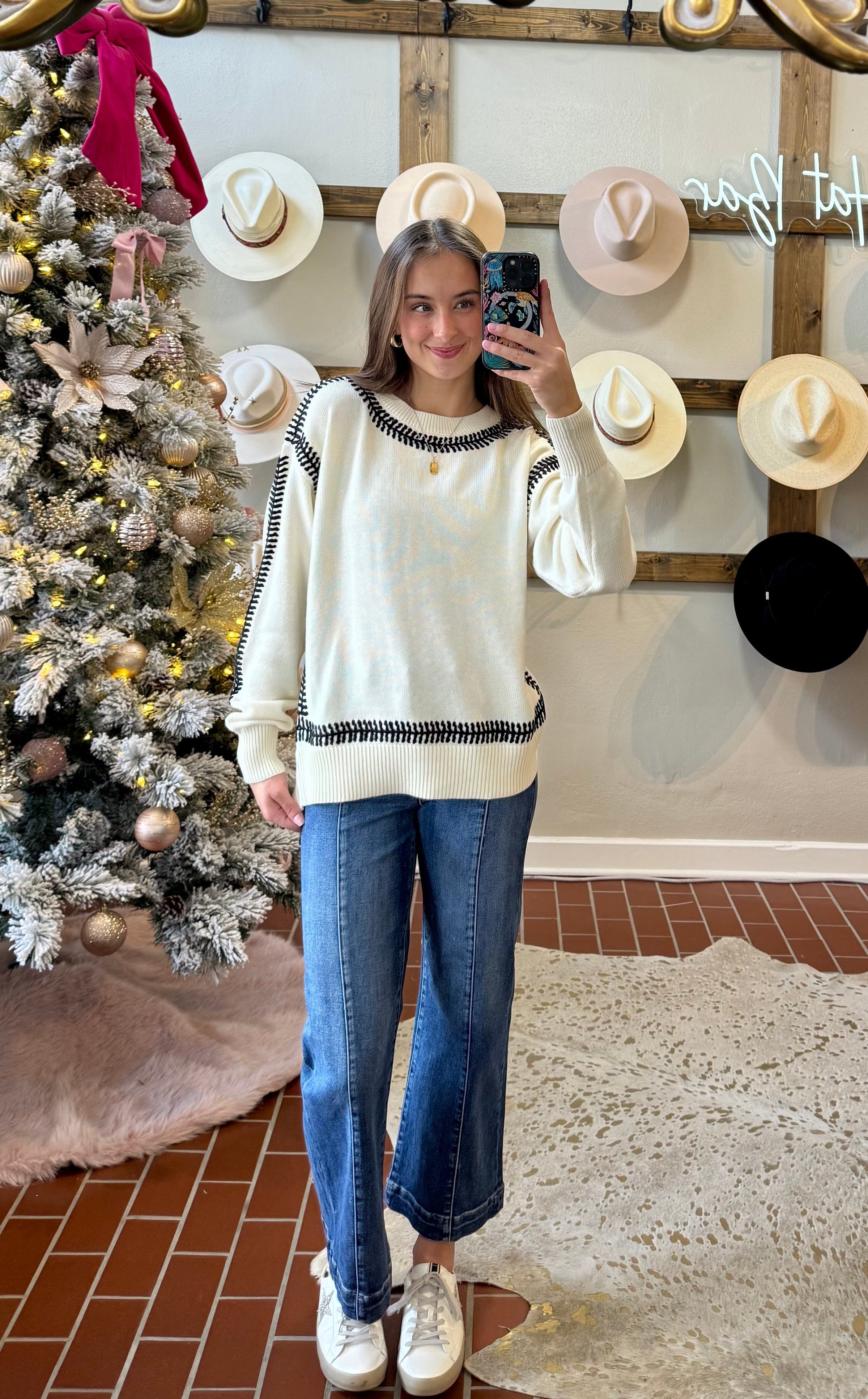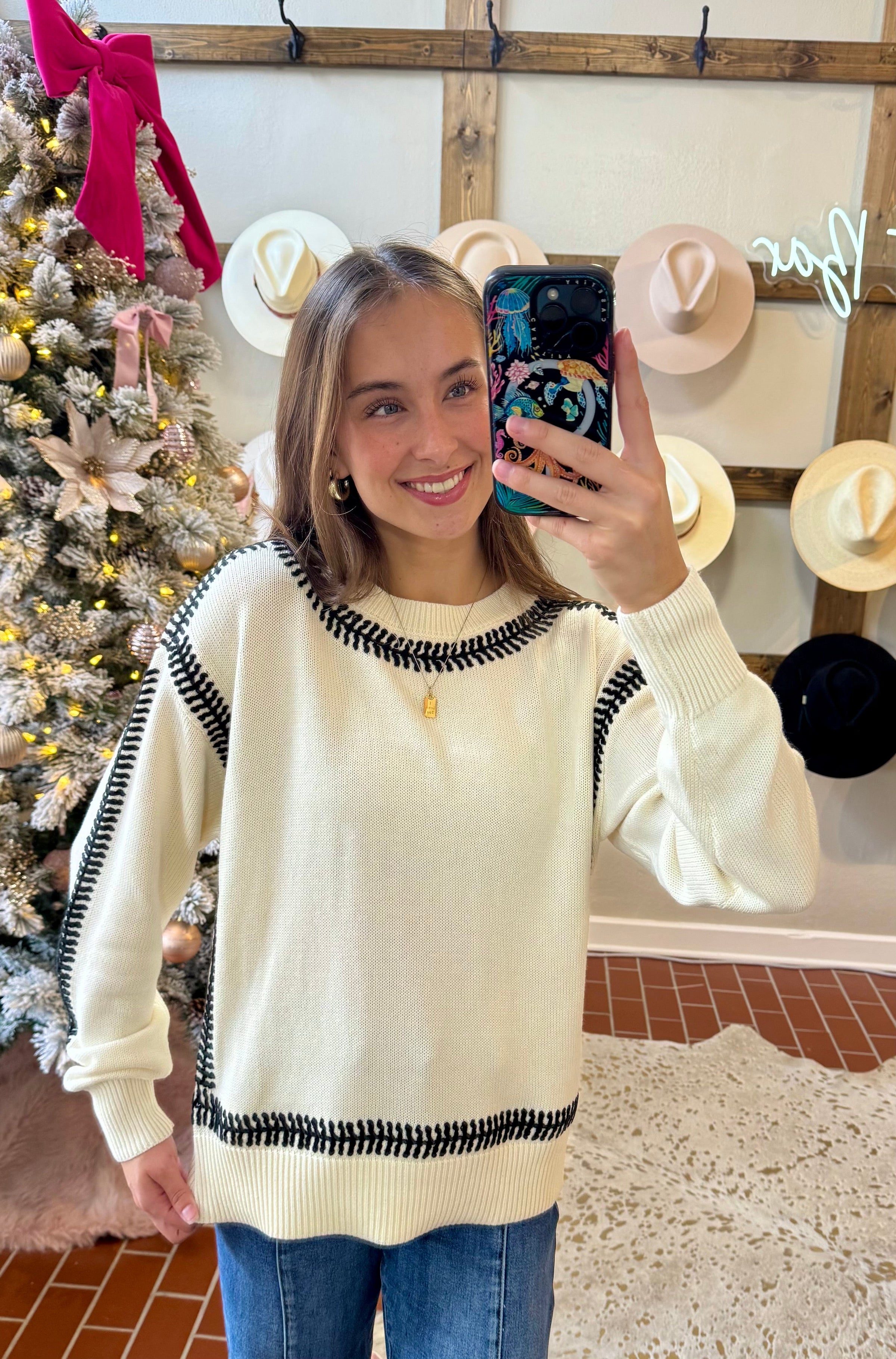 Indulge in the charming Another Love Zana Top! Adorned with a stylish white and black combo, this sweater features eye-catching thick black stitching along the neckline and hemlines. Perfect for any occasion, this top is both fashionable and versatile. Elevate your wardrobe and make a statement with the Another Love Zana Top!