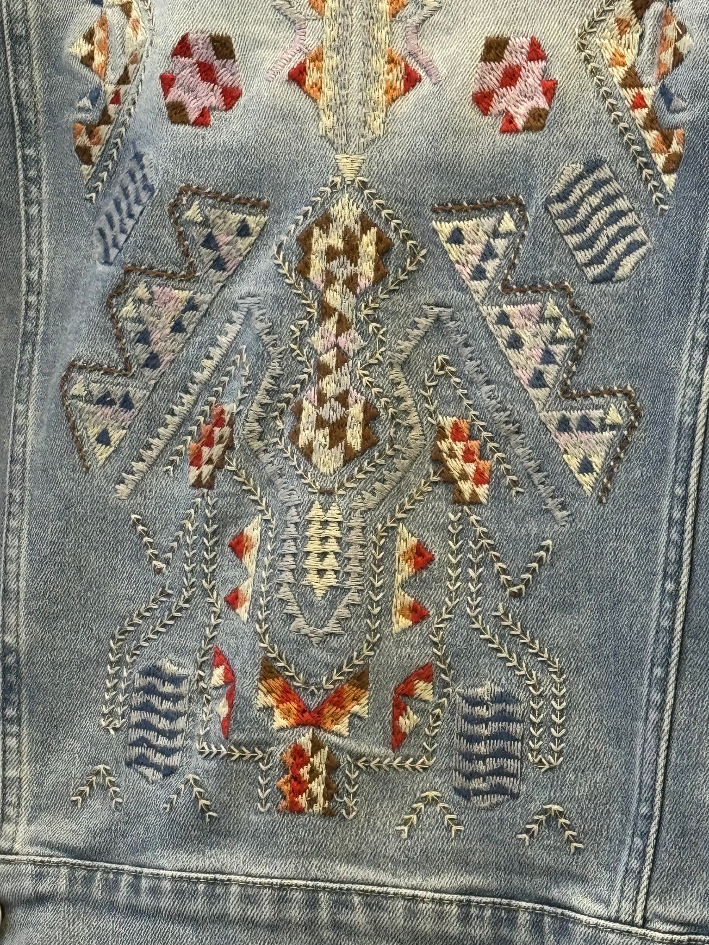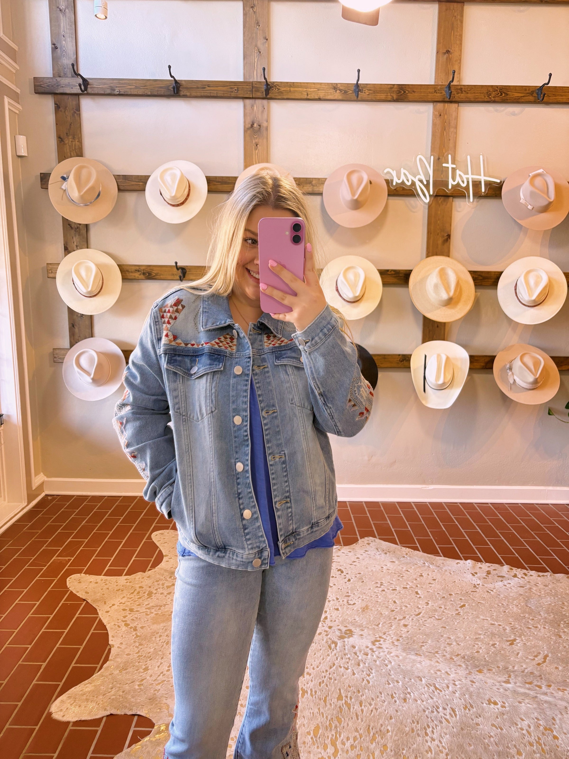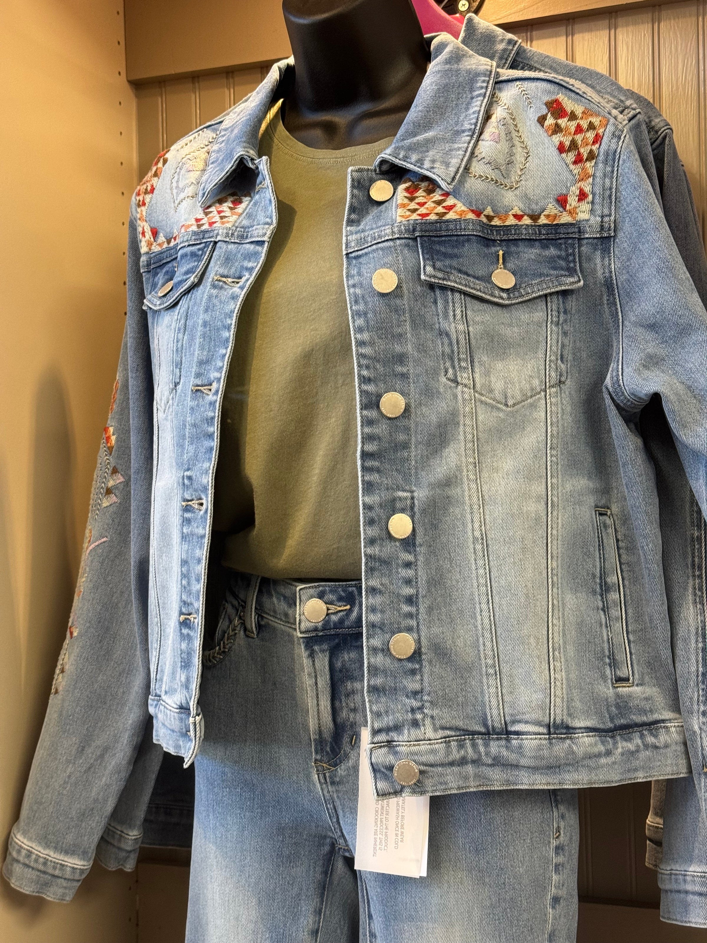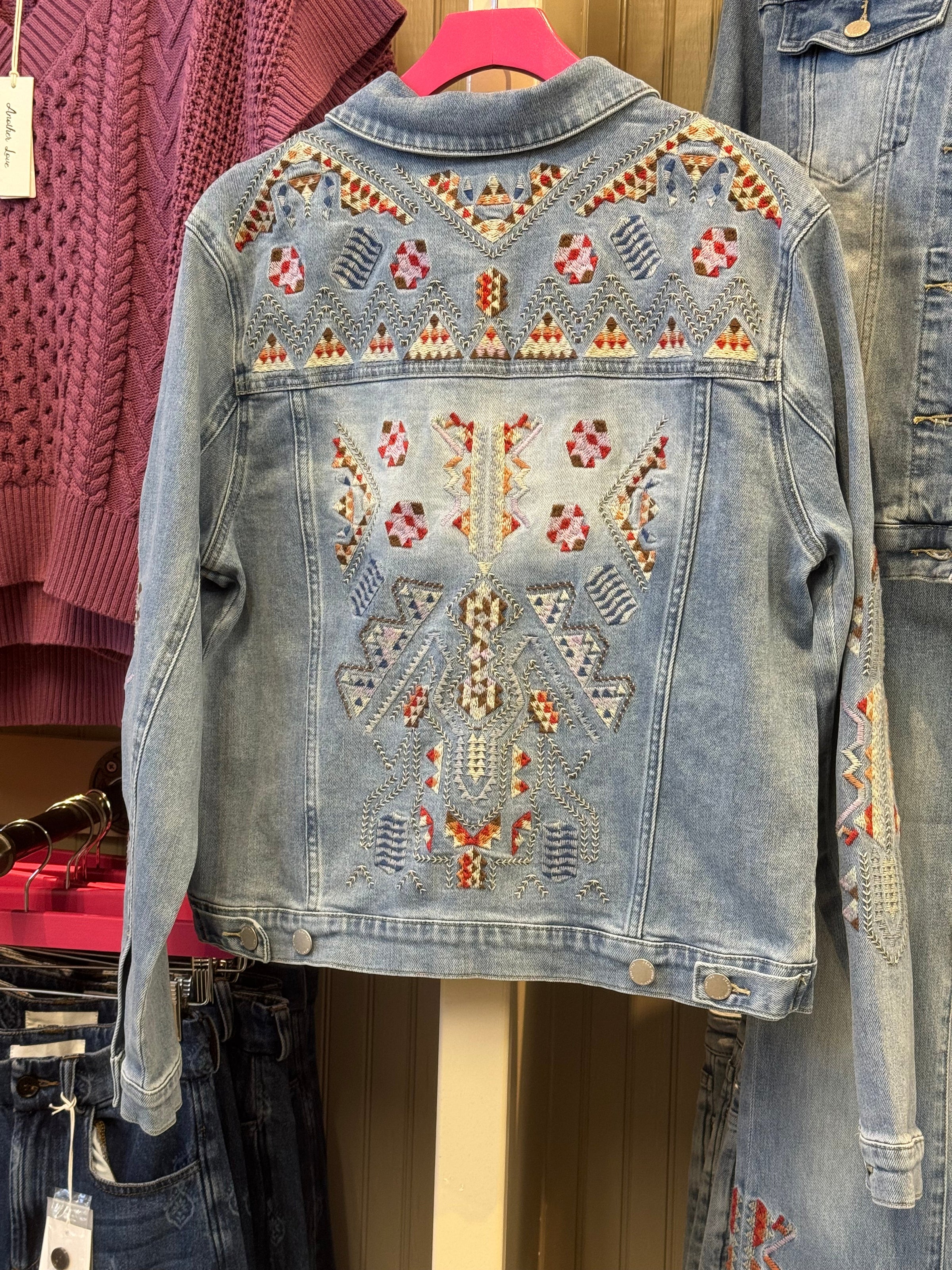 Elevate your denim game with this stunning Santa Fe jacket, featuring intricate embroidered Southwest-inspired details that make it a true statement piece. The medium-wash denim strikes the perfect balance—soft enough for all-day comfort yet versatile enough to wear year-round. Whether you're layering for cooler months or throwing it over a summer dress, this jacket delivers effortless style with authentic craftsmanship. True to size and undeniably gorgeous, it's the one piece your collection has been missing.