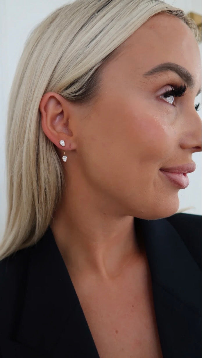 Elevate your everyday style with the Olivia Earrings—a sophisticated pair featuring delicate crystal studs positioned at the top and beneath the ear for an elegant, dimensional look. Crafted with 18k gold plating, these dainty earrings deliver a feminine touch that complements any occasion, from casual days to special moments. The refined crystal detailing catches light beautifully, making them a versatile staple that effortlessly transitions from morning to night.