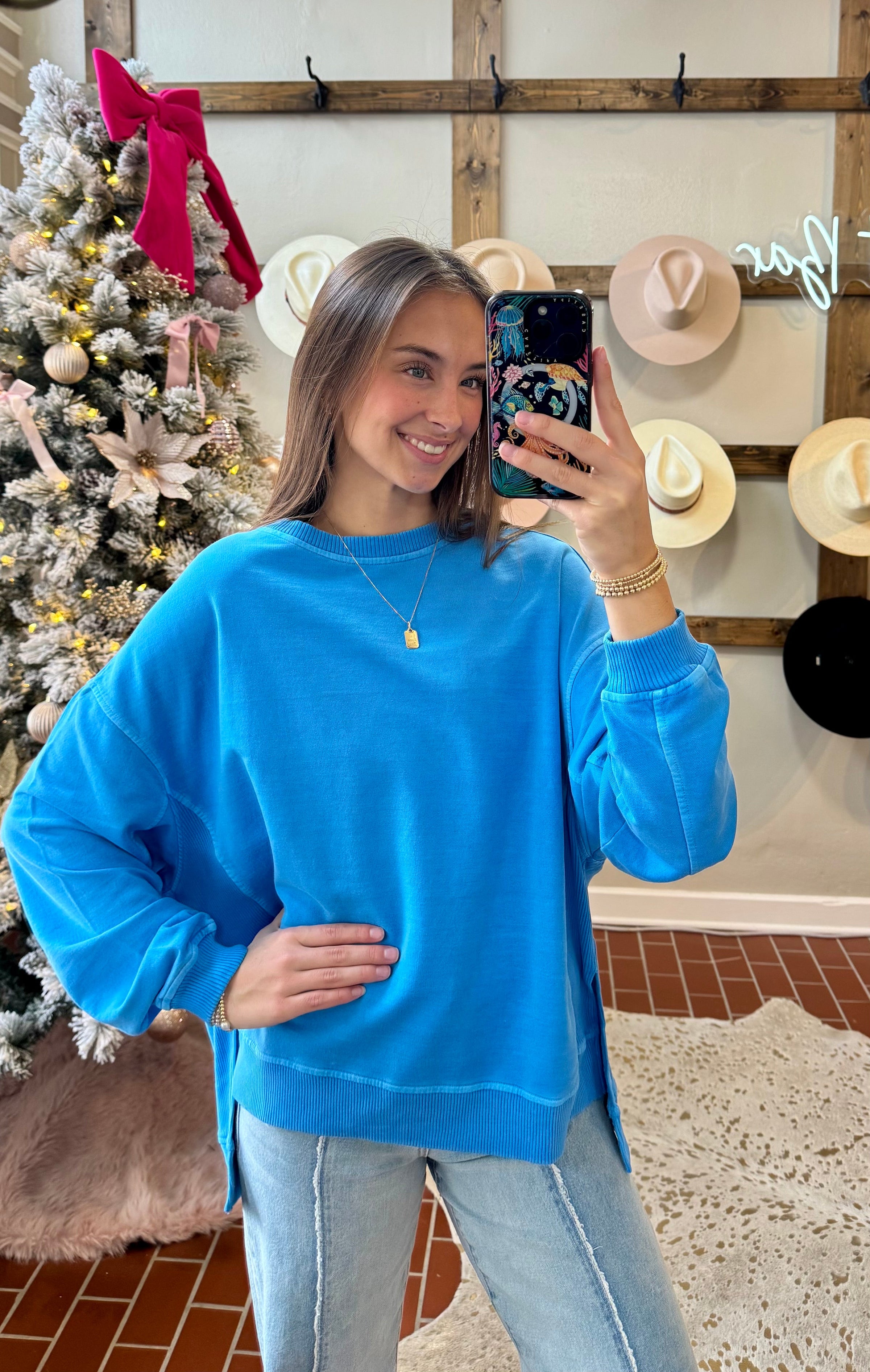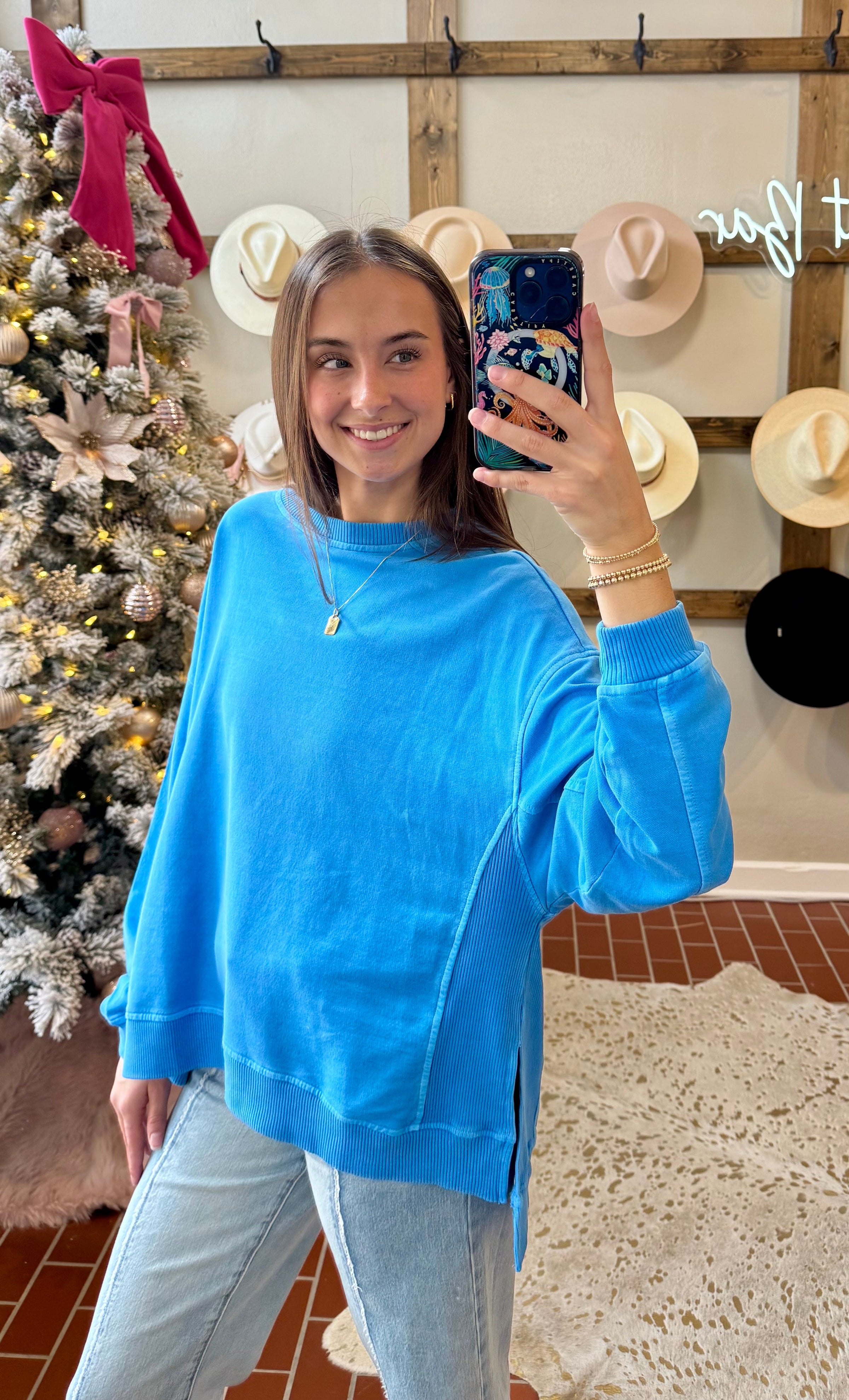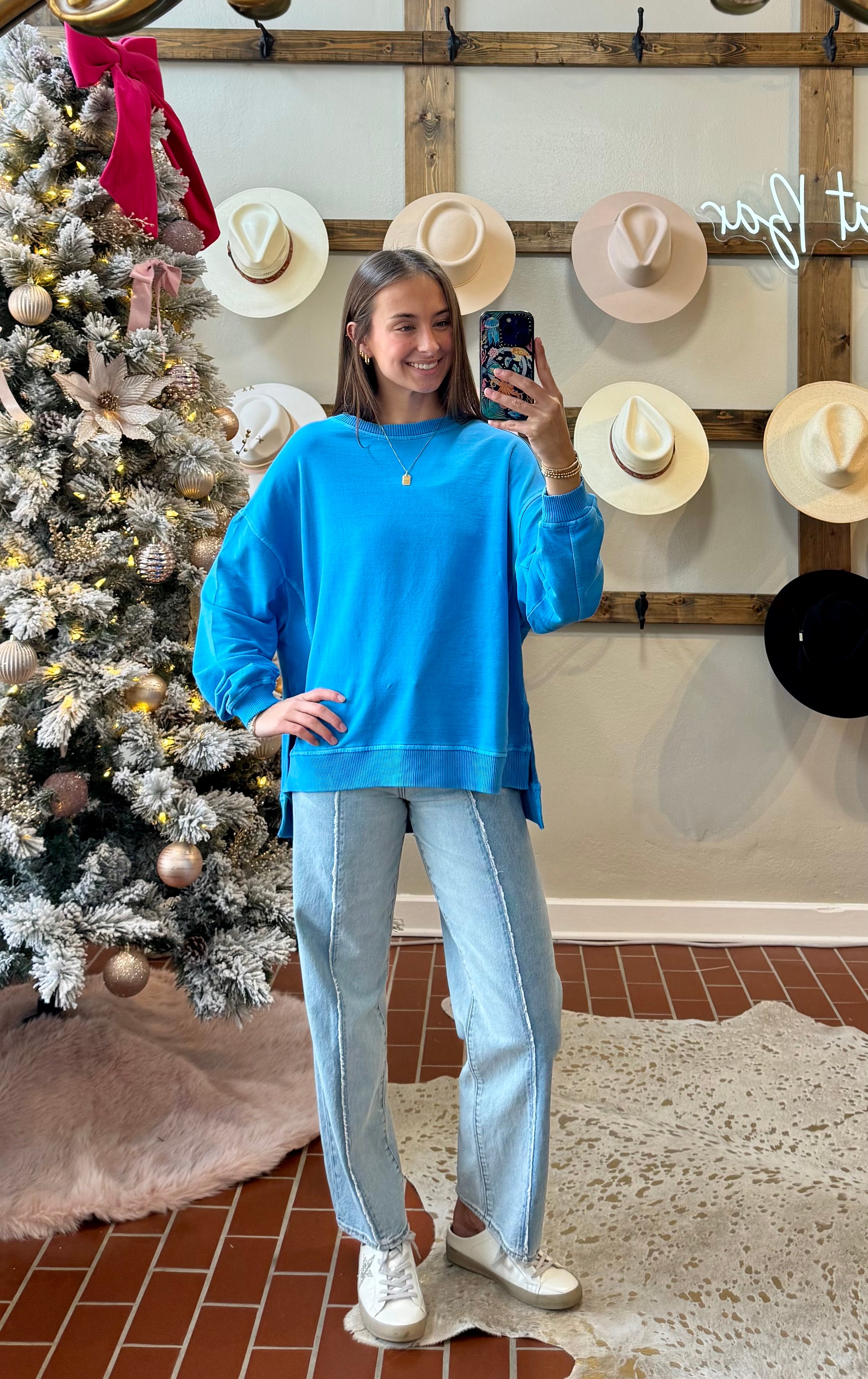 Effortlessly chic meets ultimate comfort in this French terry pullover, crafted with a pigment dye and enzyme wash for that coveted vintage aesthetic. The hi-low hem and strategic side slits create flattering movement and dimension, while the relaxed fit ensures all-day wearability. With a front length of 25.5" and back length of 28", this piece drapes beautifully on the frame. Approximate chest measurement of 48" offers generous room for layering. Each pullover's unique color variation—a natural result of our artisanal washing process—makes yours truly one-of-a-kind. Perfect for casual outings or elevated loungewear moments.