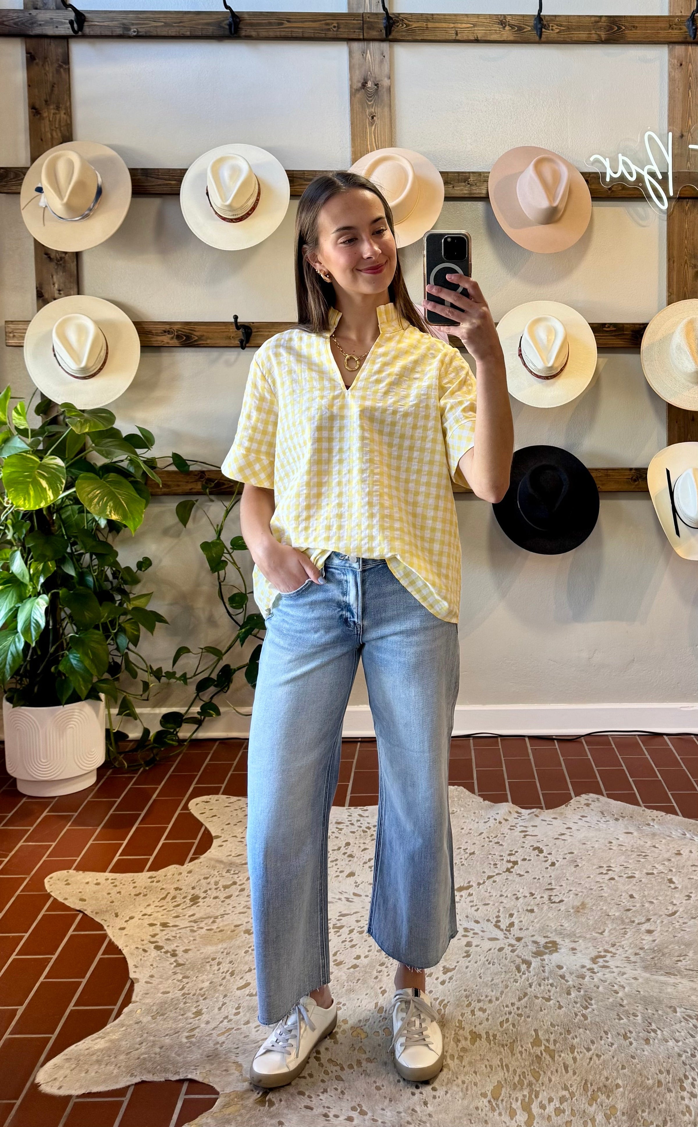 Crisp gingham weave meets effortless style in this lightweight short-sleeve top. The stand collar V-neck creates a flattering silhouette perfect for layering or wearing solo, while the unlined, non-sheer construction ensures comfort and confidence all day. Versatile enough for casual weekends or dressed up for work, this piece transitions seamlessly from season to season. Pair with our White Risen Denim for a dressy brunch look or pair it with your favorite denim.