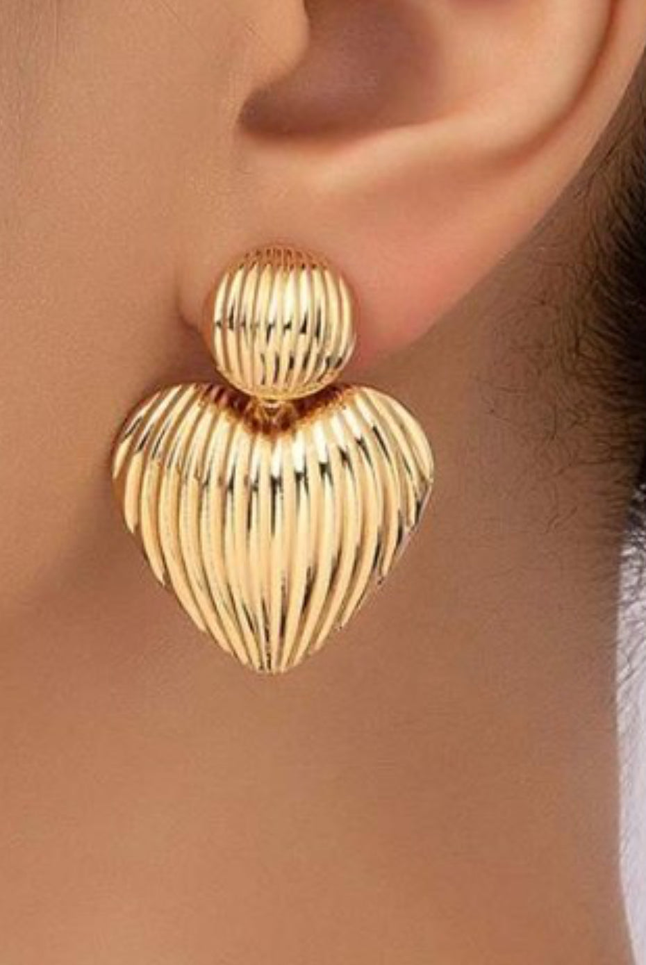 Real Gold Dipped Ribbed Heart Drop Earrings, these earrings feature adorable ribbed heart drop earrings. Designs meticulously crafted from high-quality stainless steel with a radiant 18K gold finish. Their tarnish-free, hypoallergenic, and fade-resistant.