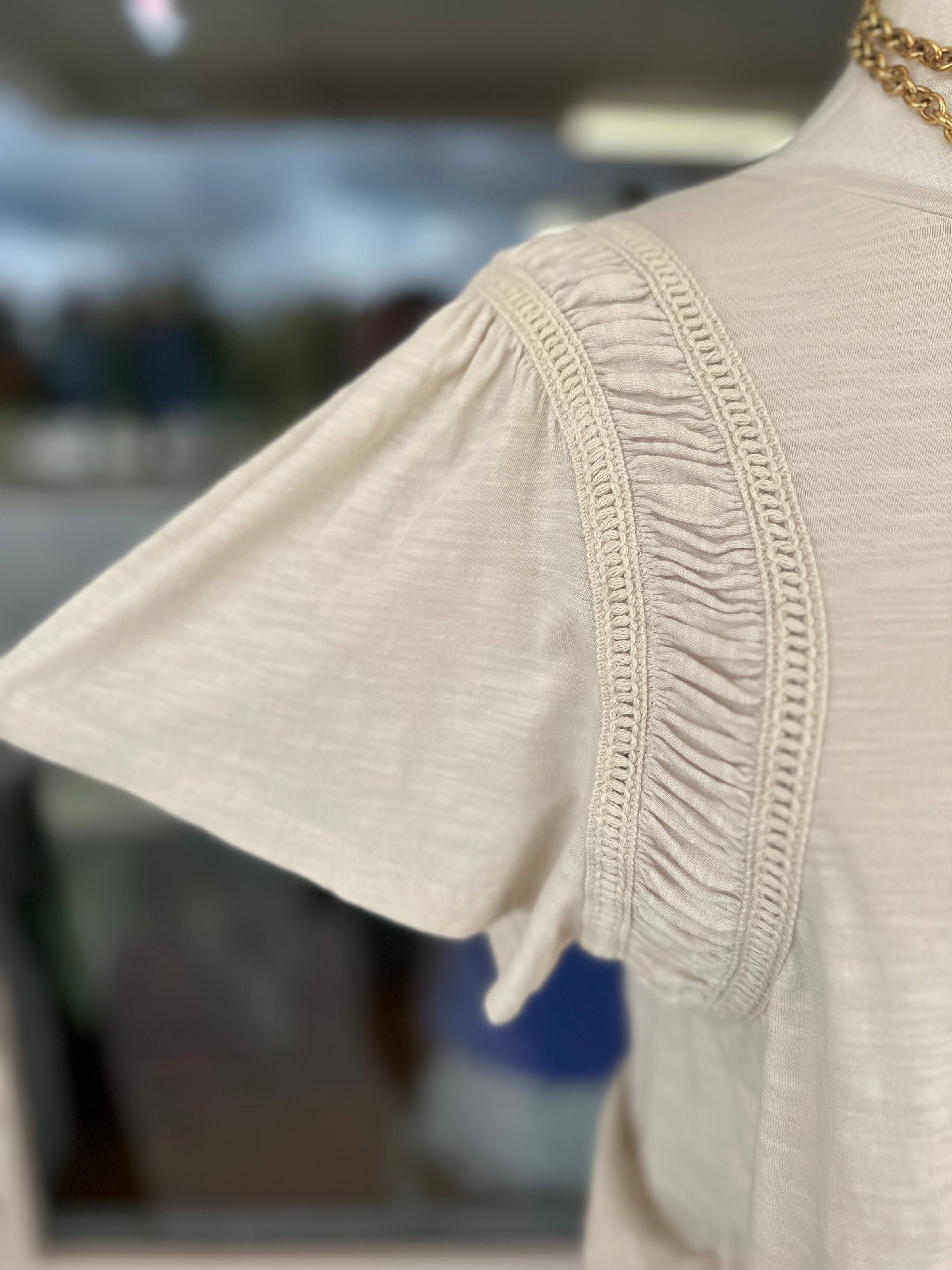 Delightful Francine flutter sleeve top with intricate lace trim, providing a perfect blend of elegance and comfort. Crafted for a classic fit, seamlessly enhancing any wardrobe with its timeless charm. Ideal for dressing up or down, it effortlessly transitions through any occasion.