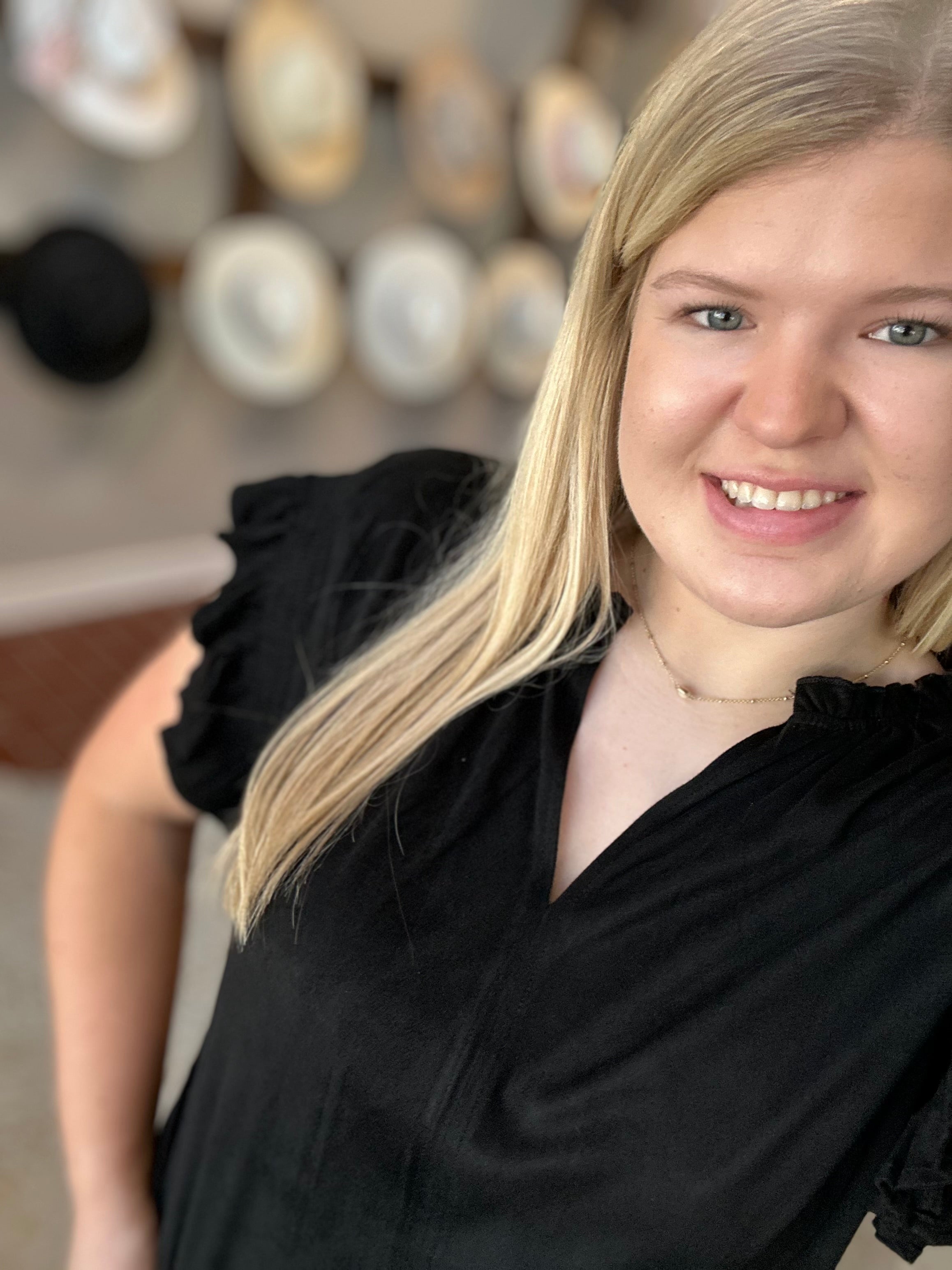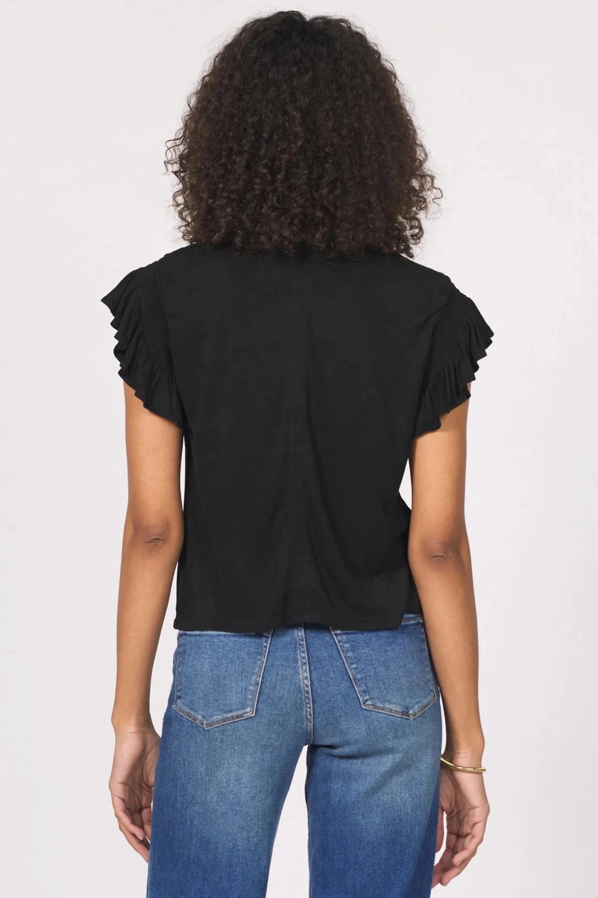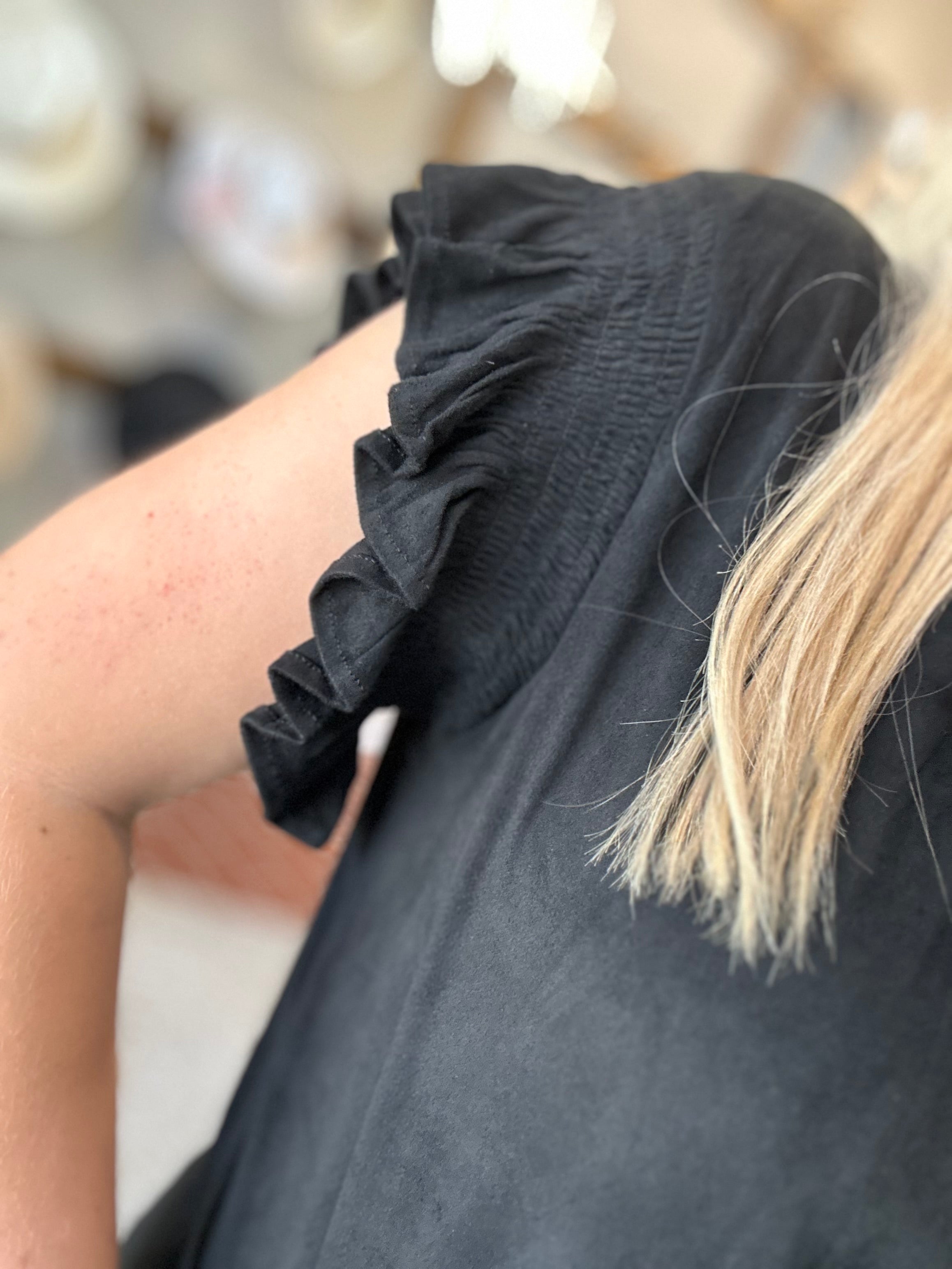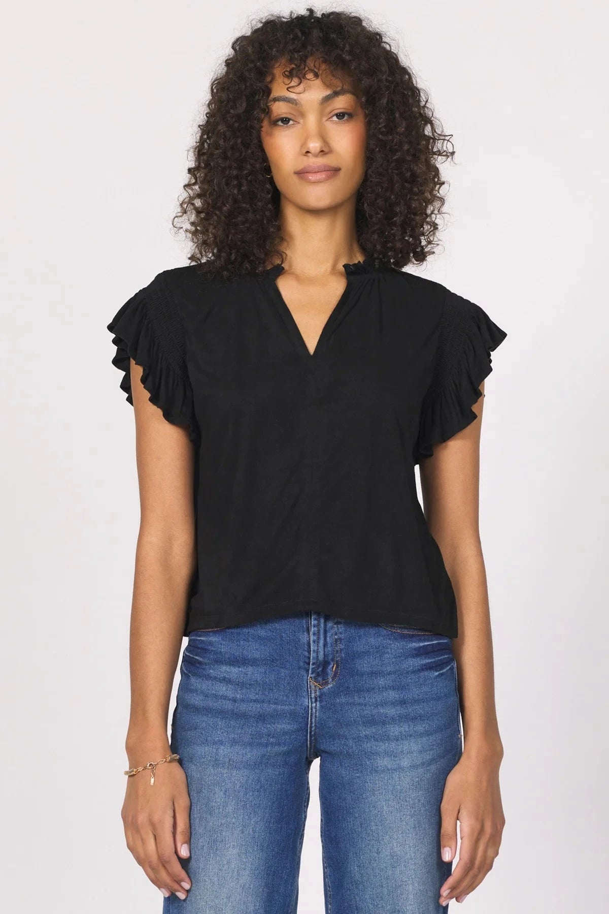 Nicola with ruffle v-neck top in relaxed fit, featuring smocking short sleeve for a touch of sophistication. Made with care in suede, blending elegance and comfort seamlessly. The chic utility for any lifestyle, a perfect fit with polished appearance.