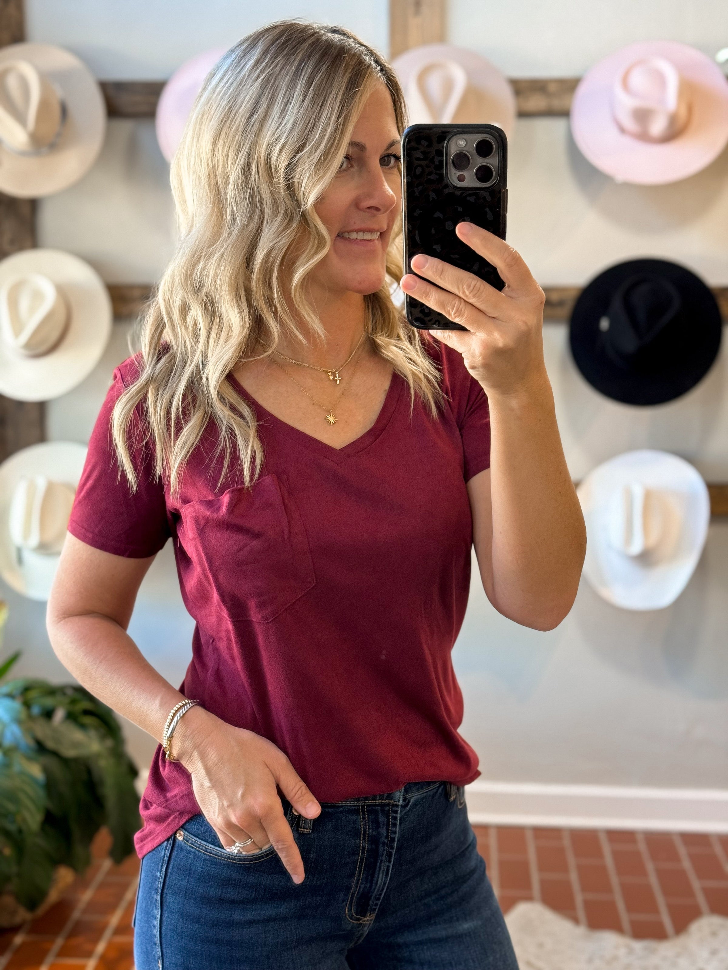 V-neck pocket tee finished with a curved hem. Perfect top for running errands or just a relaxing day at home. Solid color brush woven on standard fit.