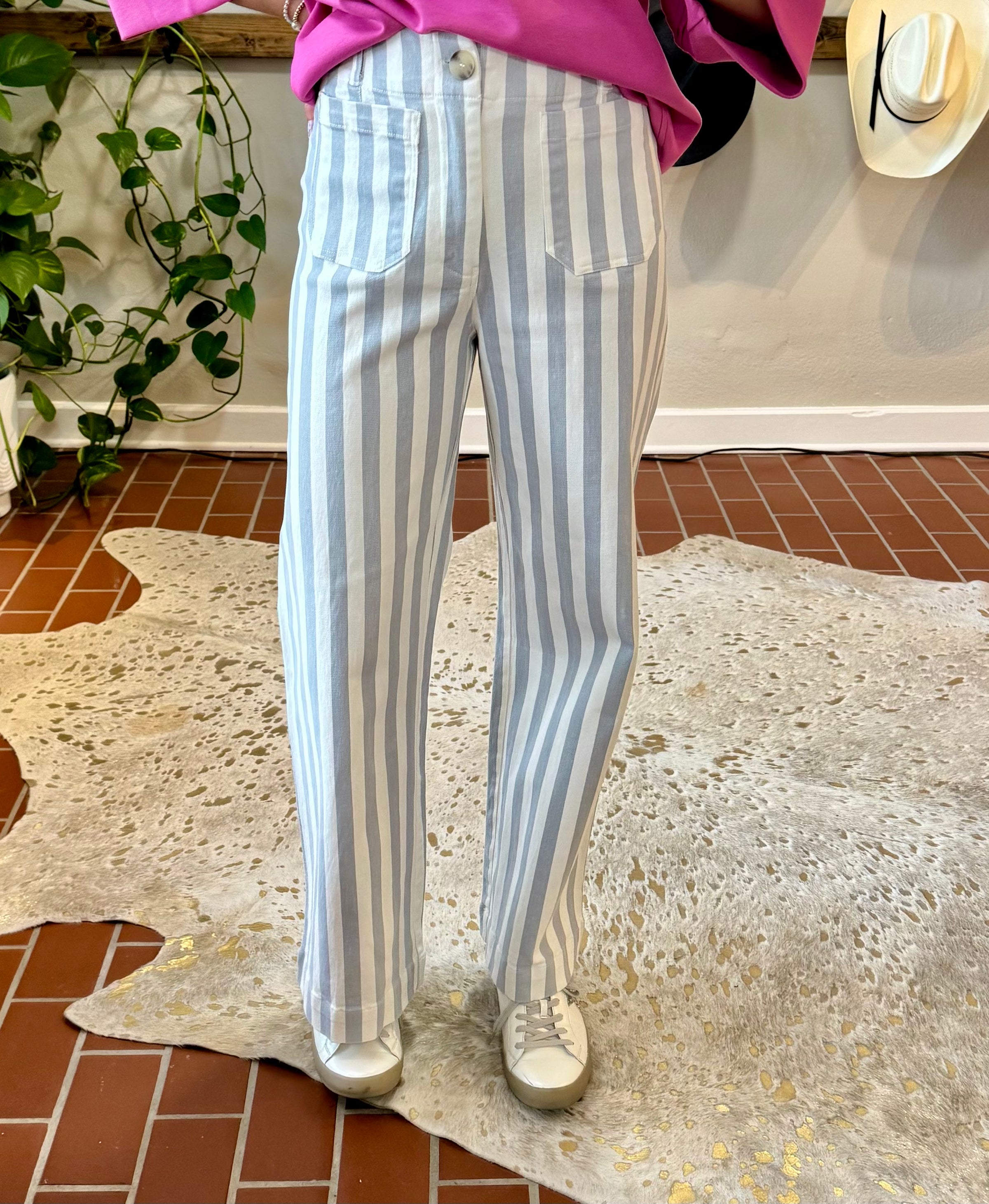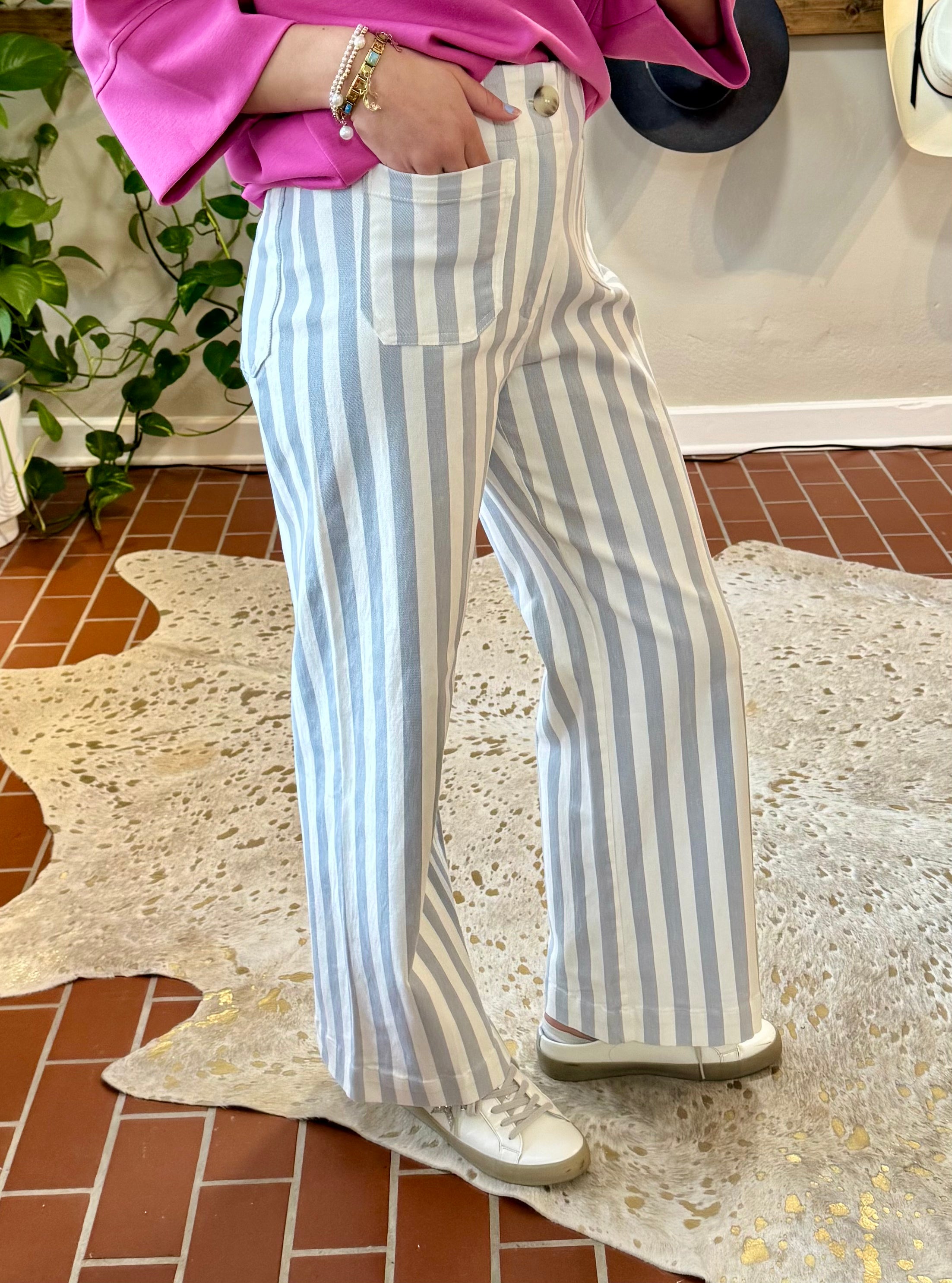 High-rise striped pants designed for a polished, lengthening silhouette. The structured straight leg pairs seamlessly with any top, while functional details—button and zipper closure, belt loops, and front and back patch pockets—deliver everyday practicality. A timeless wardrobe essential that transitions effortlessly from casual to refined.
