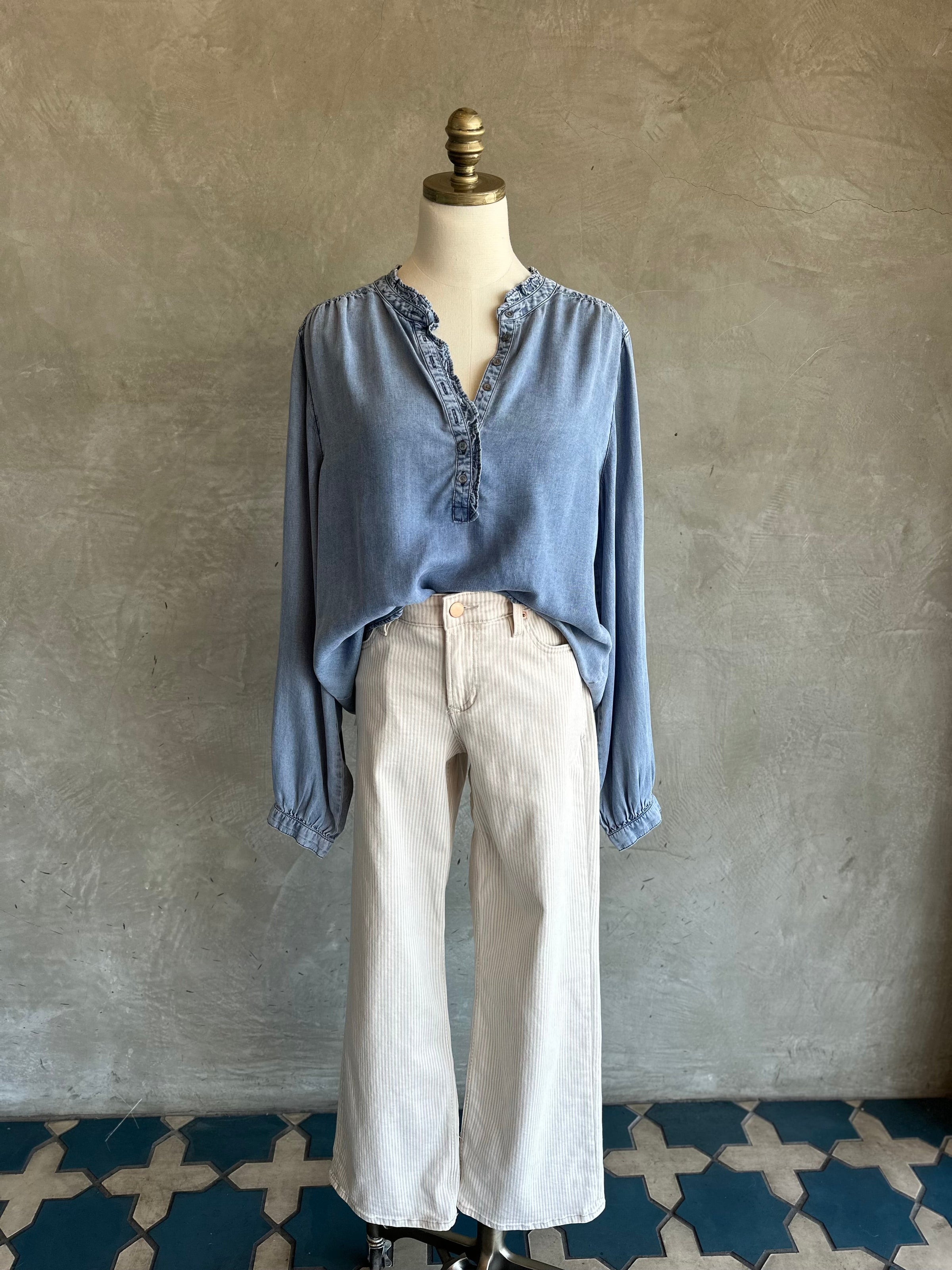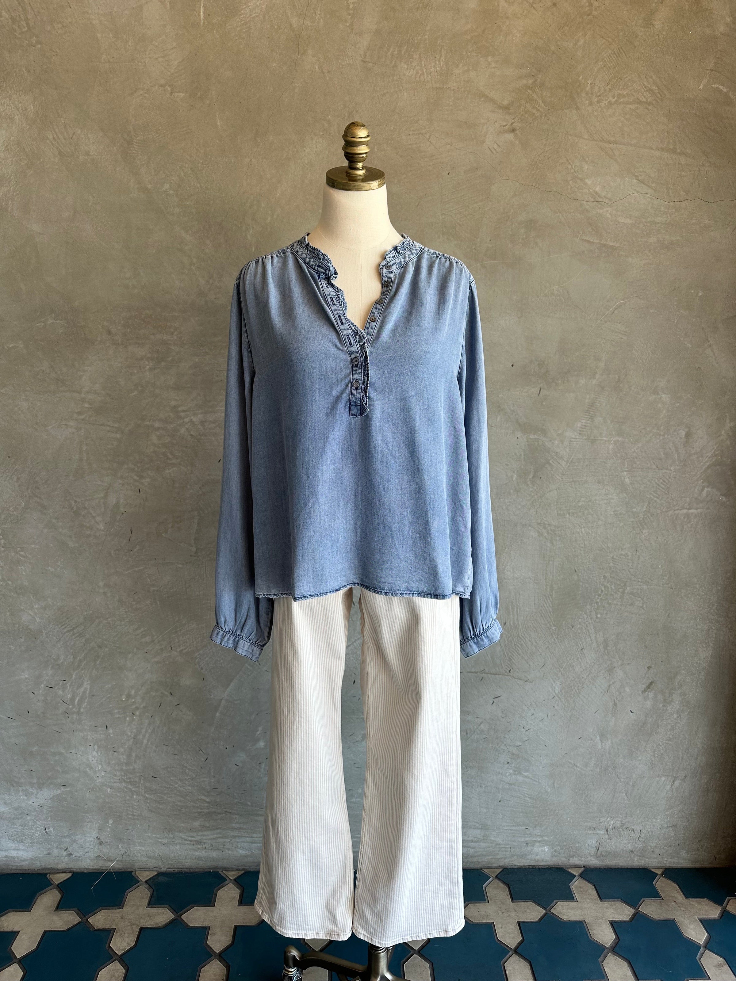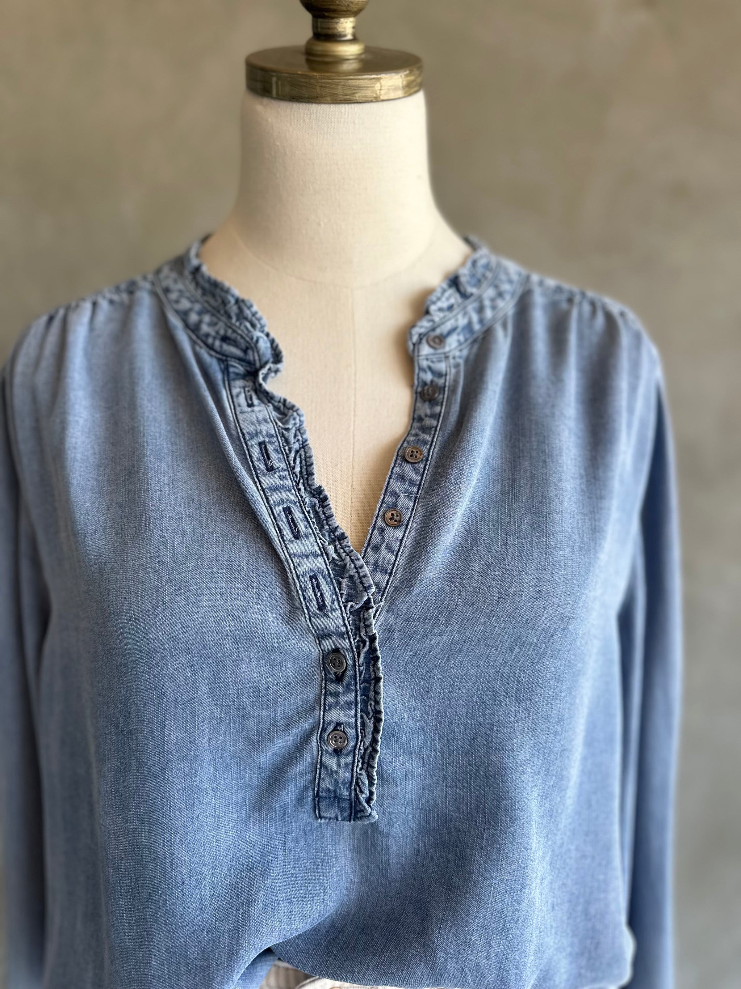 Chatra henley long-sleeve top featuring elegant ruffle detailing.