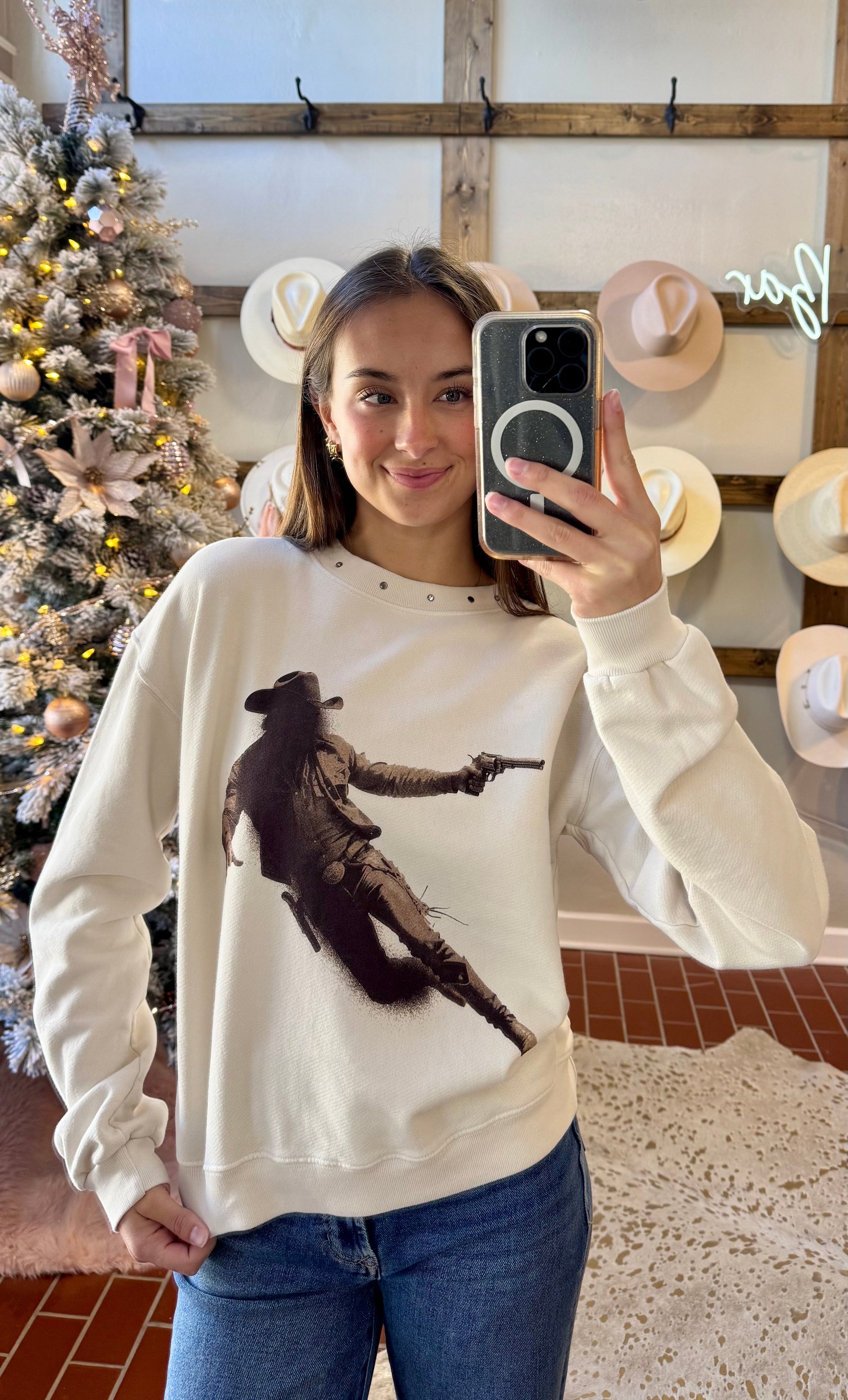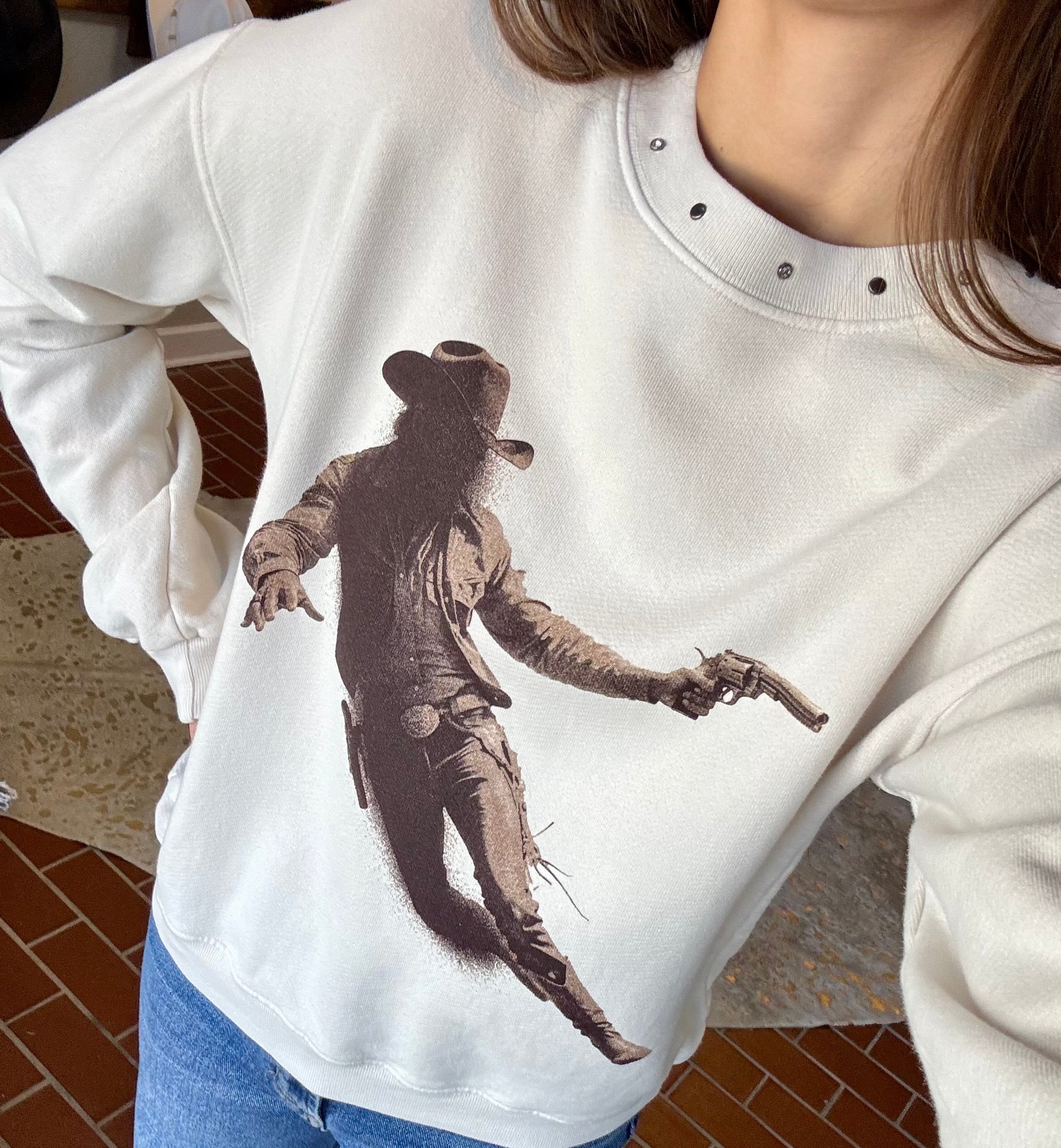 Embrace the stylish Western spirit with this Gunslinger Sweatshirt, crafted from a vintage cream fabric that exudes timeless charm. Perfect for adding a rugged, trendy touch to your wardrobe, its comfortable fit makes it ideal for everyday wear. Elevate your casual look with the distinctive gunslinger print that captures bold, adventurous vibes. Features studded brads that add a little extra to the vibe.