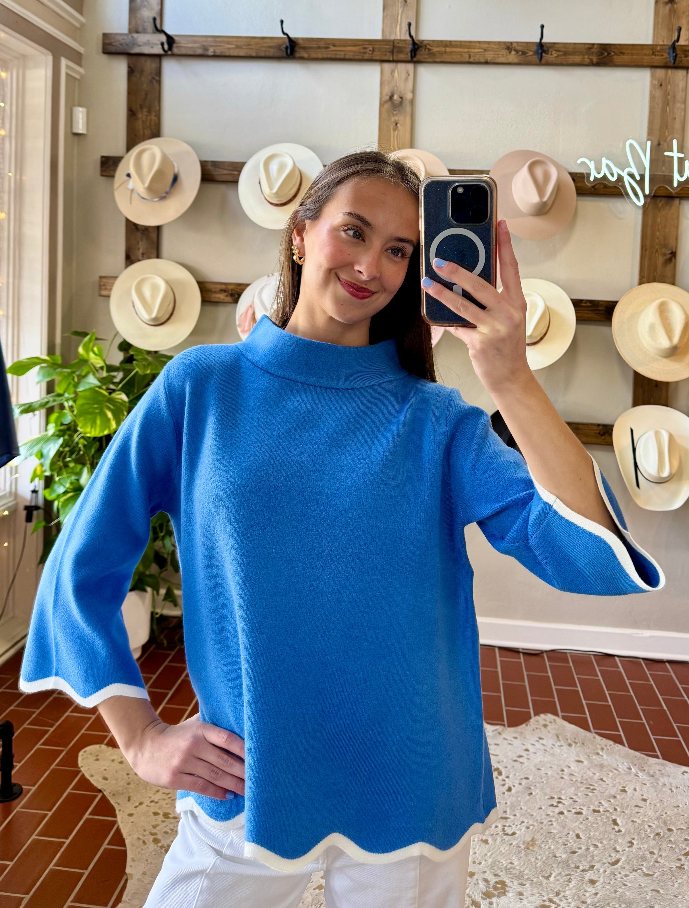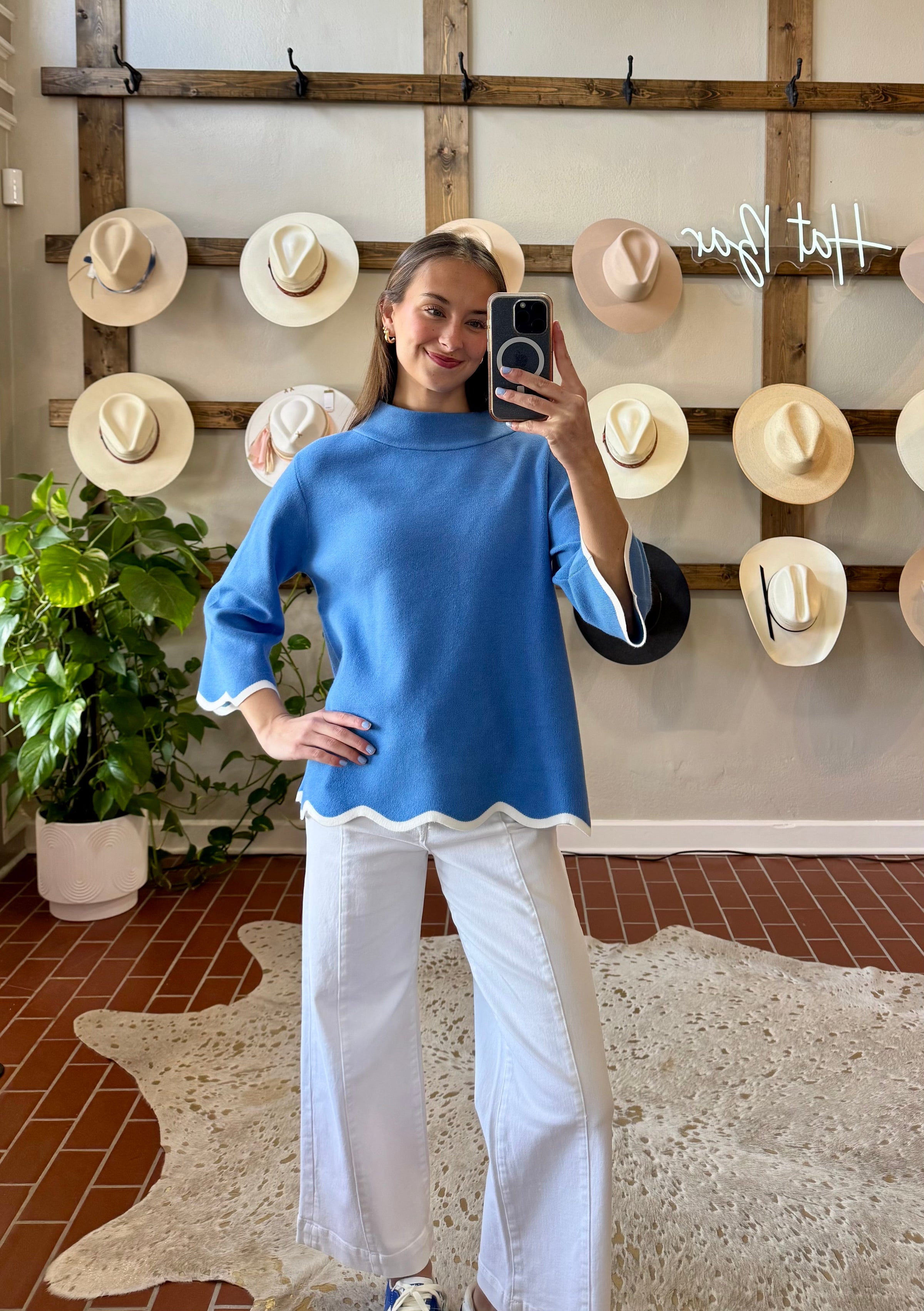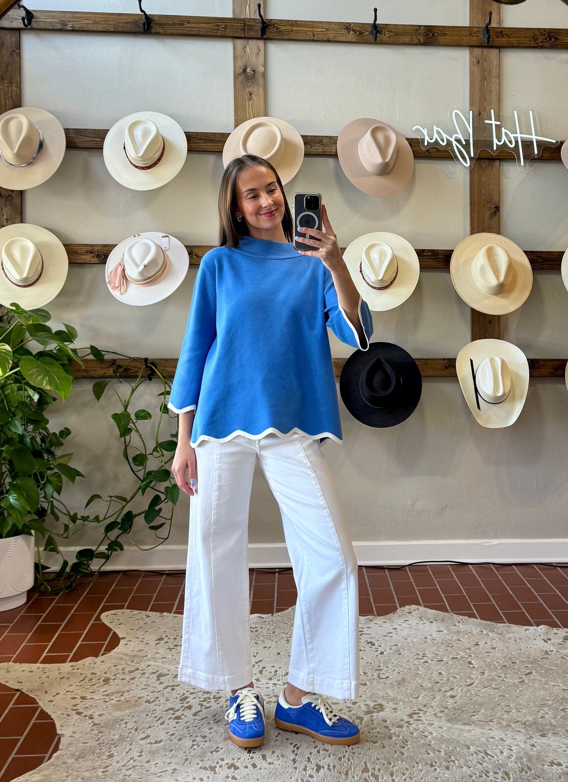 Elevate your everyday wardrobe with the Lisa Scalloped Top, a soft blue and cream moc neck sweater that combines timeless elegance with modern charm. The signature scalloped edge detailing adds a refined, feminine touch that sets this piece apart—perfect for layering or wearing solo. Crafted for comfort and style, this versatile sweater transitions effortlessly from casual days to polished occasions. A wardrobe essential that delivers both sophistication and wearability.