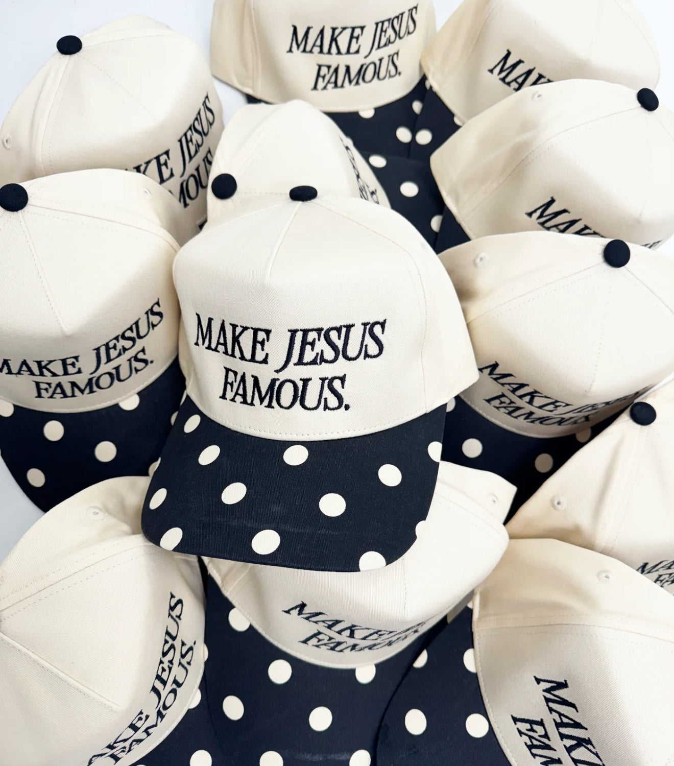 Add a splash of fun and faith to your look with the Make Jesus Famous Polka Dot Hat. Its cheerful polka dots bring a playful vibe, while the inspiring message spreads positivity wherever you go.
