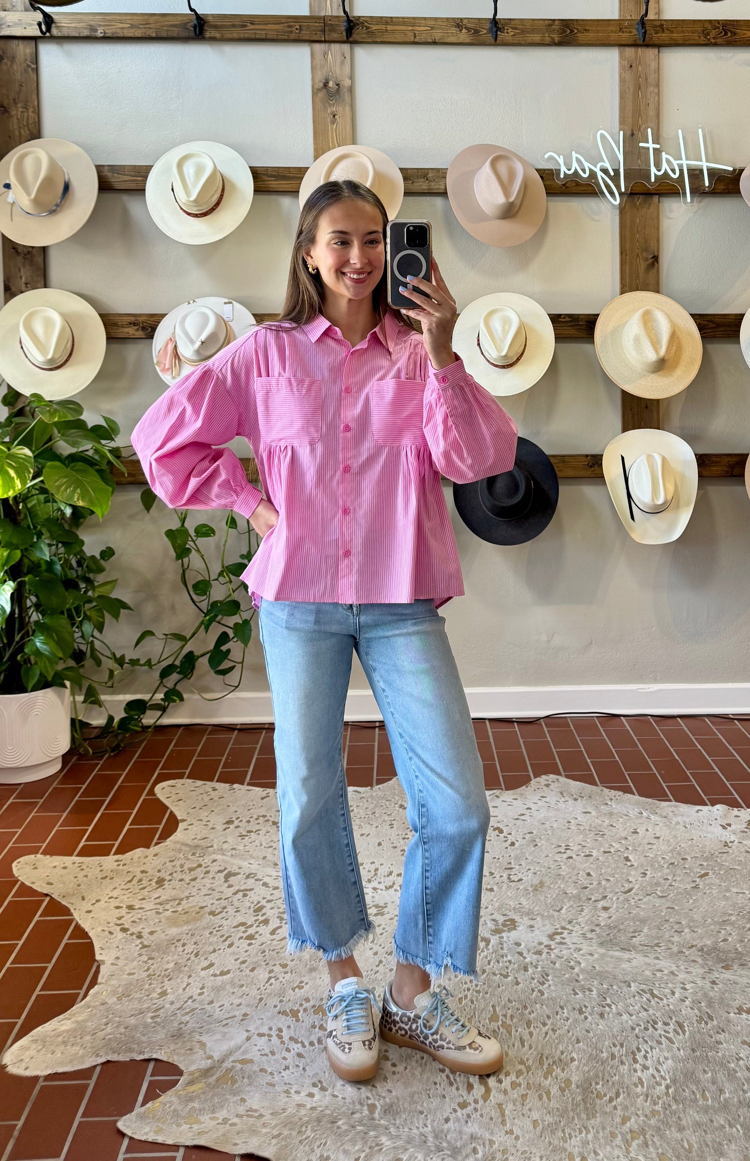 Crisp pinstripe detailing meets soft pink in this versatile button-down that effortlessly elevates any casual look. Pair with tailored denim, or wear with white for an instantly polished aesthetic. The structured fit and timeless pattern make it a wardrobe essential that transitions seamlessly from weekend to weekday wear.