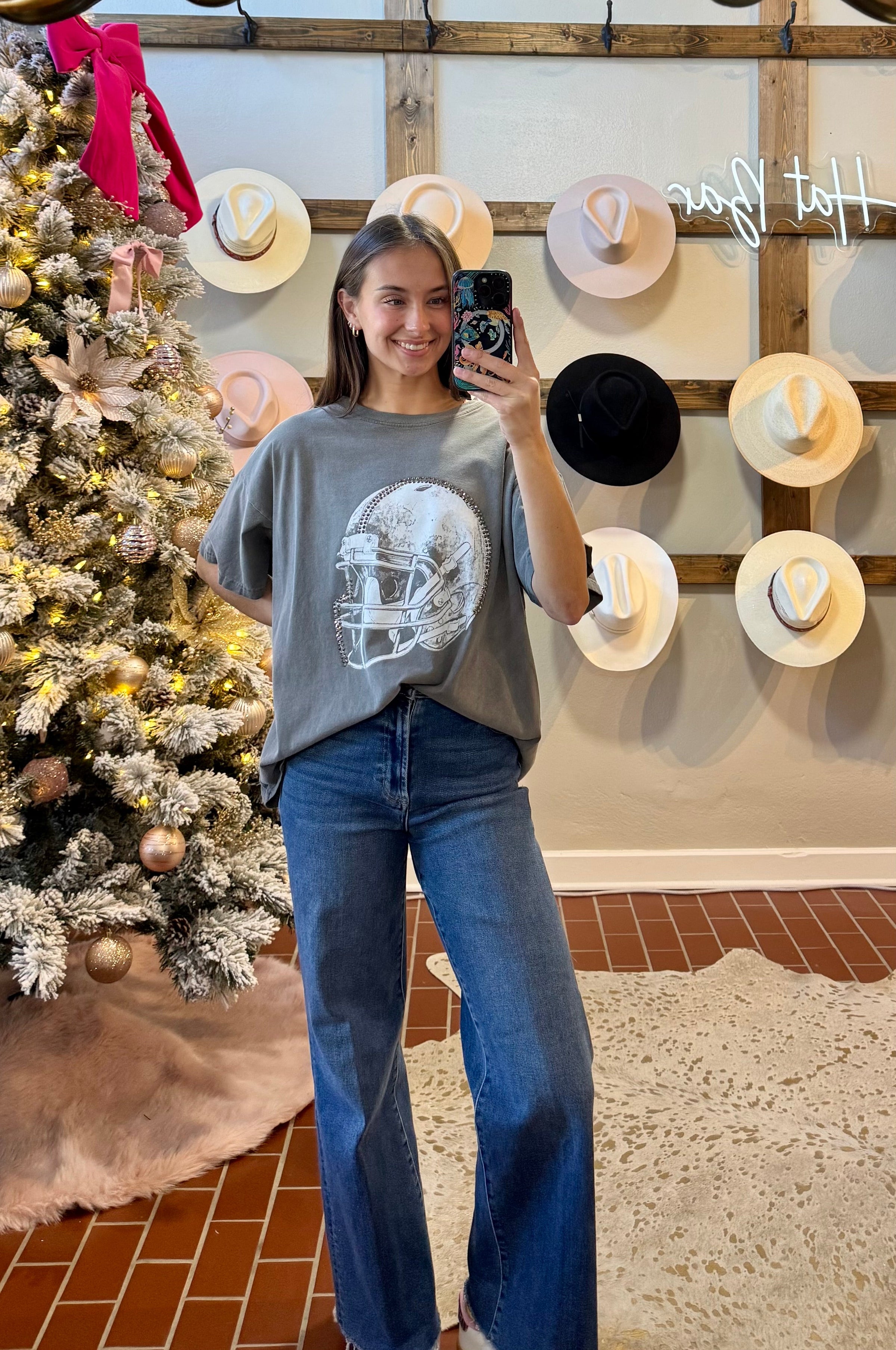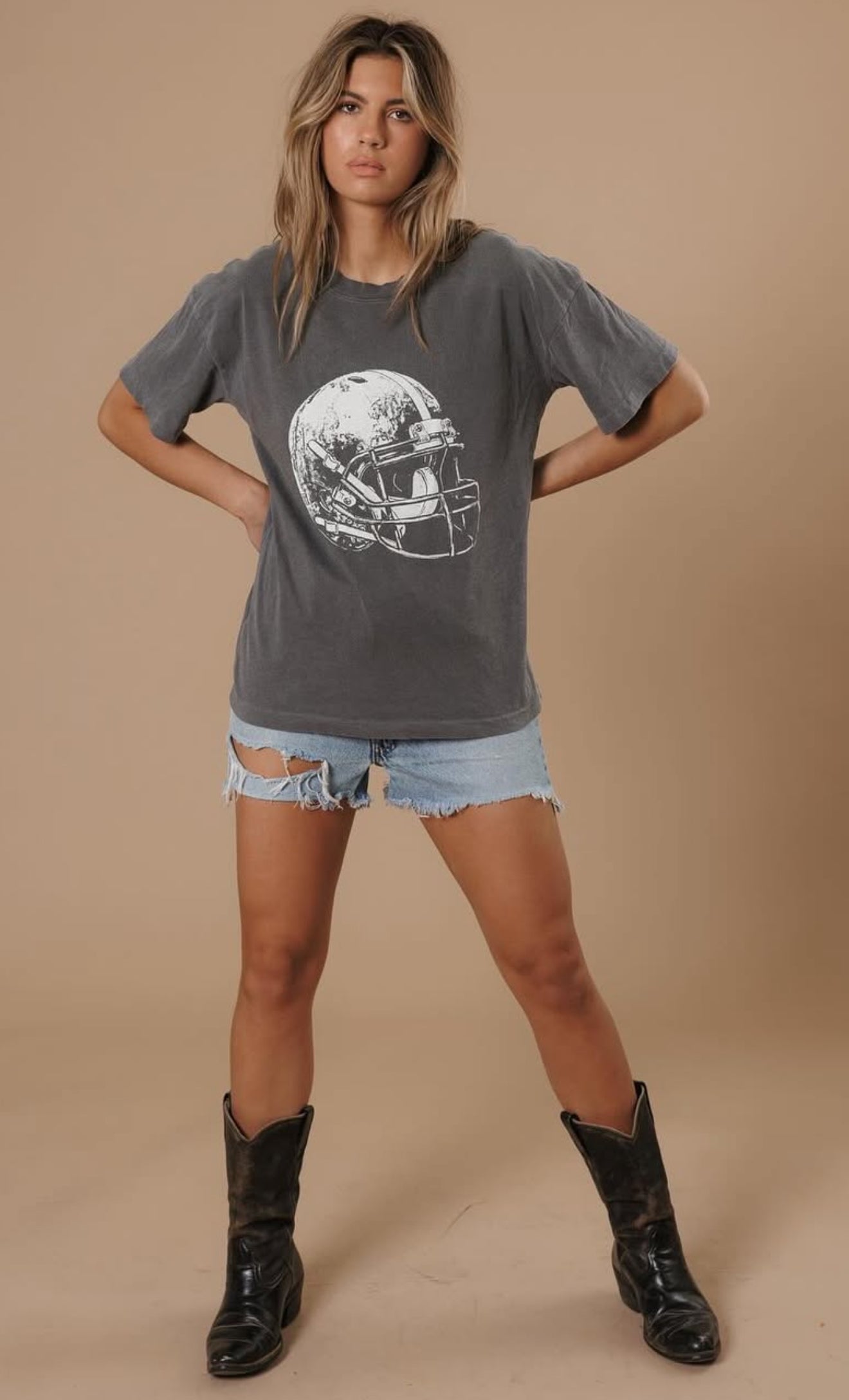 The cutest vintage-washed tee featuring a rhinestone football helmet design — perfect for any team on game day!