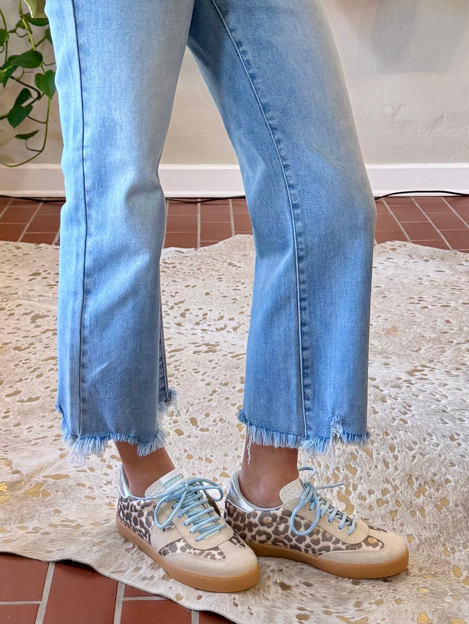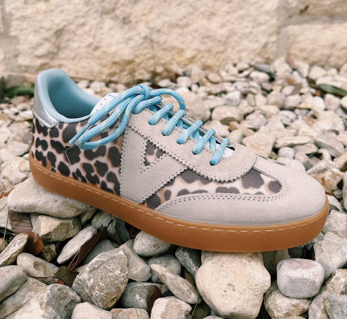 Victoria Beige Leopard Sneakers blend timeless animal print with contemporary style. Crafted in Spain with meticulous handmade construction, these sneakers feature luxe suede and leather detailing paired with a striking metallic silver heel. The soft baby blue shoelaces add a fresh, seasonal touch perfect for spring and summer wardrobes. Comfortable enough for everyday wear, yet distinctive enough to elevate any casual look